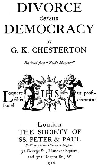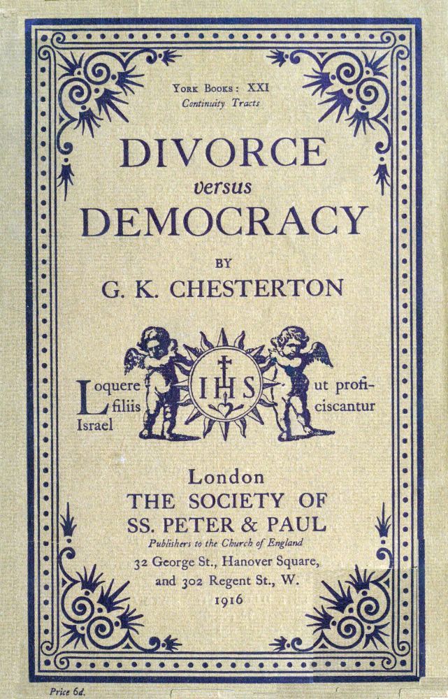 Well, if one happens to believe in democracy as I do, as a large trust in the active and passive judgment of the human conscience, one can have no hesitation, no “impartiality,” about one’s view of divorce; and especially about one’s view of the extension of divorce among the democracy. A democrat in any sense must regard that extension as the last and vilest of the{6} insults offered by the modern rich to the modern poor. The rich do largely believe in divorce; the poor do mainly believe in fidelity. But the modern rich are powerful and the modern poor are powerless. Therefore for years and decades past the rich have been preaching their own virtues. Now that they have begun to preach their vices too, I think it is time to kick.