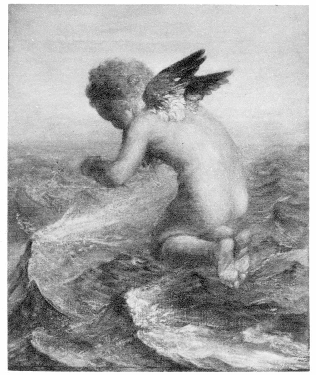 Similar lines of comparison, so far as they appear to possess any value, could, of course, be very easily pointed out in connexion with the character of{62} Watts’ draughtsmanship. That his lines are simple and powerful, that both in strength and weakness they are candid and austere, that they are not Celtic, not Catholic, and not romantic lines of draughtsmanship, would, I think, appear sufficiently clear to anyone who has any instinct for this mode of judgment at all. In the matter of line and composition, of course, the same general contention applies as in the case of colour. The curve of the bent figure of Hope, considered simply as a curve, half repeating as it does the upper curve of the globe, suggests a feeling, a sense of fear, of simplicity, of something which lies near to the nature of the idea itself, the idea which inspires the title of the picture. The splendid rushing whirlpool of curves which constitutes, as it were, the ellipse of the two figures in Diana and Endymion is a positive inspiration. It is, simply as a form for a picture, a mere scheme of lines, the very soul of Greece. It is simple; it is full and free; it follows great laws of harmony, but it follows them swiftly and at will; it is headlong, and yet at rest, like the solid arch of a waterfall. It is a rushing and passionate meeting of two superb human figures; and it is almost a mathematical harmony. Technically, at least, and as a matter of outlines, it is probably the artist’s masterpiece.