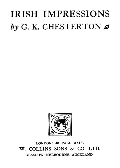 I have often done the little I could to correct the stale trick of taking things for granted: all the more because it is not even taking them for granted. It is taking them without gratitude; that is, emphatically as not granted. Even one’s own front door, released by one’s own latchkey, should not only open inward on things familiar, but outward on things unknown. Even one’s own domestic fireside should be wild as well as domesticated; for nothing could be wilder than fire. But if this light of the higher ignorance should shine even on familiar places, it should naturally shine most clearly on the roads of a strange land. It would be well if a man could enter Ireland really knowing that he knows nothing about Ireland; if possible, not even the name of Ireland. The[22] misfortune is that most men know the name too well, and the thing too little. This book would probably be a better book, as well as a better joke, if I were to call the island throughout by some name like Atlantis, and only reveal on the last page that I was referring to Ireland. Englishmen would see a situation of great interest, objects with which they could feel considerable sympathy, and opportunities of which they might take considerable advantage, if only they would really look at the place plain and straight, as they would at some entirely new island, with an entirely new name, discovered by that seafaring adventure which is the real romance of England. In short, the Englishman might do something with it, if he would only treat it as an object in front of him, and not as a subject or story left behind him. There will be occasion later to say all that should be said of the need of studying the Irish story. But the Irish story is one thing and what is called the Irish Question quite another; and in a purely practical sense the[23] best thing the stranger can do is to forget the Irish Question and look at the Irish. If he looked at them simply and steadily, as he would look at the natives of an entirely new nation with a new name, he would become conscious of a very strange but entirely solid fact. He would become conscious of it, as a man in a fairy tale might become conscious that he had crossed the border of fairyland, by such a trifle as a talking cow or a haystack walking about on legs.