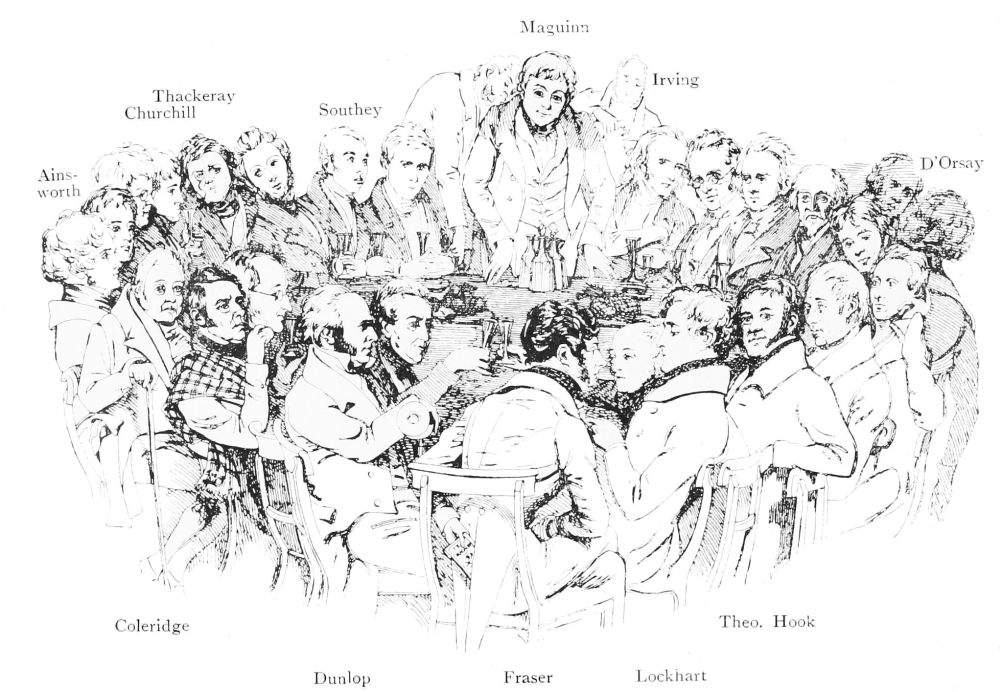 In January 1835 Thackeray appeared as one of the Fraserians in a sketch drawn by Maclise and published in Fraser’s Magazine. This celebrated cartoon depicts the Fraser writers at one of the frequent banquets held at 212, Regent Street. It was in this company that Thackeray first gained distinction as an author.