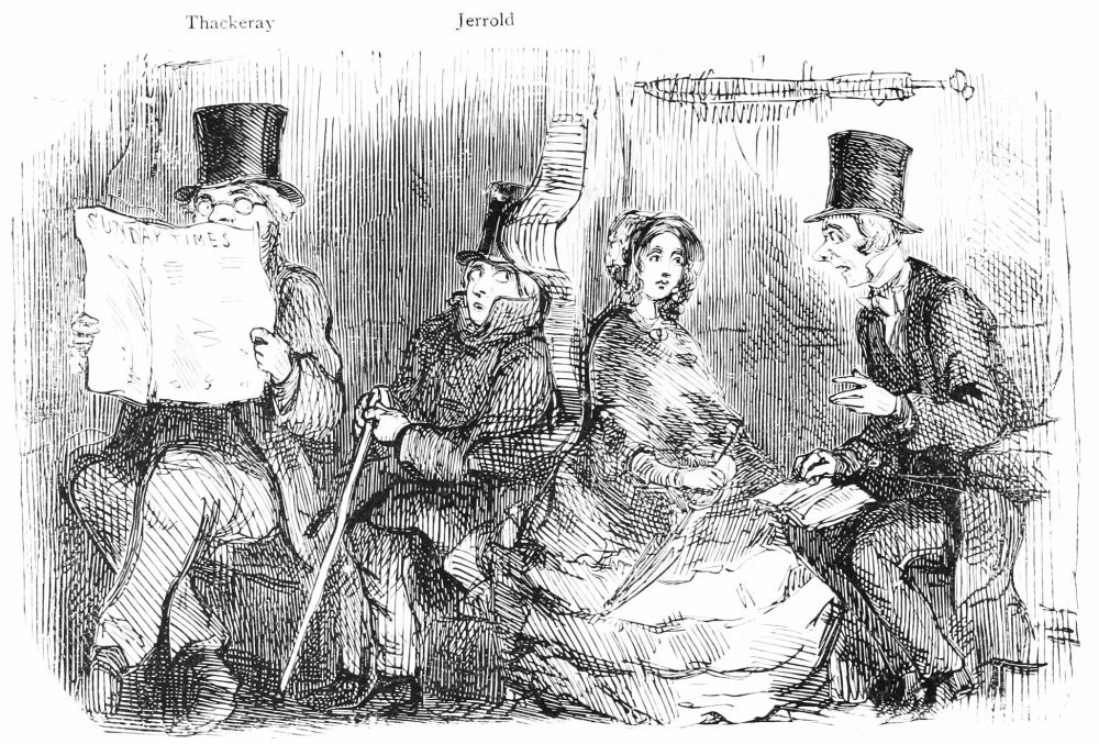 During the same year “The History of Samuel Titmarsh and the Great Hoggarty Diamond” commenced to run its course in Fraser’s Magazine. Punch had been started on July 17th, and Thackeray’s first contributions appeared the following June. In the course of his ten years’ connection with this periodical he contributed something like 500 sketches irrespective of letterpress. One of these, reproduced on page 12, is taken from a series entitled “Authors’ Miseries,” and represents Jerrold and the artist himself in a railway carriage listening to the other occupants discussing the members of the Punch staff:—