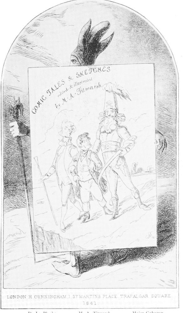 When there came to be a question of republishing the tales in these volumes, the three authors, Major Gahagan, Mr. Fitzroy Yellowplush, and myself, had a violent dispute upon the matter of editing; and at one time we talked of editing each other all round. The toss of a halfpenny, however, decided the question in my favour.... On the title-page the reader is presented with three accurate portraits of the authors of these volumes. They are supposed to be marching hand-in-hand, and are just on the very brink of Immortality.