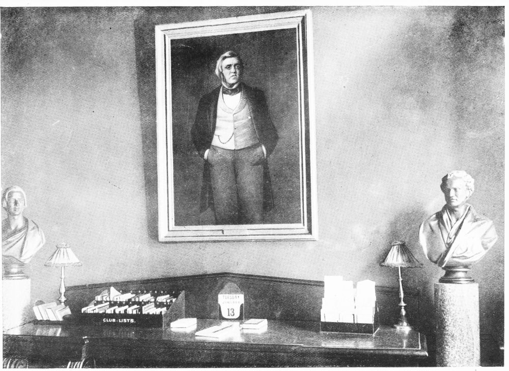 Thackeray, who for some time had been a member of the Garrick Club, was elected to the Reform in 1840, being proposed by Mr. Martin Thackeray and seconded by Mr. Henry Webbe. Sir Wemyss Reid gives an interesting description of the author at this Club. “Again and again I have heard descriptions of how he used to stand in the smoking-room, his back to the fire, his legs rather wide apart, his hands thrust into the trouser-pockets, and his head stiffly thrown backward, while he joined in the talk of the men occupying the semi-circle of chairs in front of him.... To some of us, at least, the Club is endeared by the thought that he was once one of ourselves; that he sat in these chairs, dined at these tables, chatted in these rooms, and, with his wise, far-seeing eyes surveyed the world from these same windows.” In the strangers’ room at the Reform Club hangs a portrait of Thackeray by Samuel Laurence. On one side of it{38} there stands a bust of Sir William Molesworth, on the other of Charles Buller. The latter seconded Thackeray when he was proposed by the Rev. W. Harness as a member of the Athenæum on February 12th, 1846. Thackeray was elected to this Club in 1851 under the rule which provides for the introduction of “persons of distinguished eminence in science, literature, or public services.”