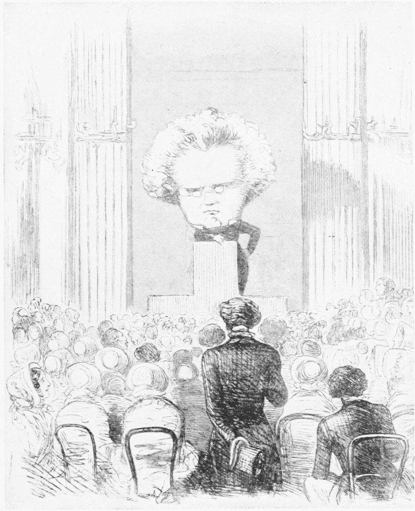 The first number of “Pendennis” appeared in November 1848, but the author’s severe illness at the end of 1849 interrupted its publication, which was not concluded until 1850. “Pendennis” was followed by “Esmond” in 1852. Whilst residing in Young Street Thackeray delivered his famous lectures on the English humorists at Willis’s Rooms. On page 21 an admirable caricature by John Leech is reproduced from The Month representing Mr. Michael Angelo Titmarsh as he appeared in these rooms in his celebrated character of Mr. Thackeray: