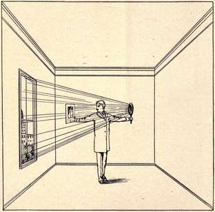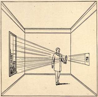 Take next your magnifying or concave mirror, and detaching the sheet of paper from the wall, hold it nearly in front of the mirror between the latter and the window. [Pg 5] When you have adjusted the distance to the focal length of the mirror, you will see an image of the window projected upon the paper, and by varying the distance, as before, you will be able to produce, at will, pictures of nearer or more remote objects. It is in this way that images are formed at the focus of the mirror of a reflecting telescope.