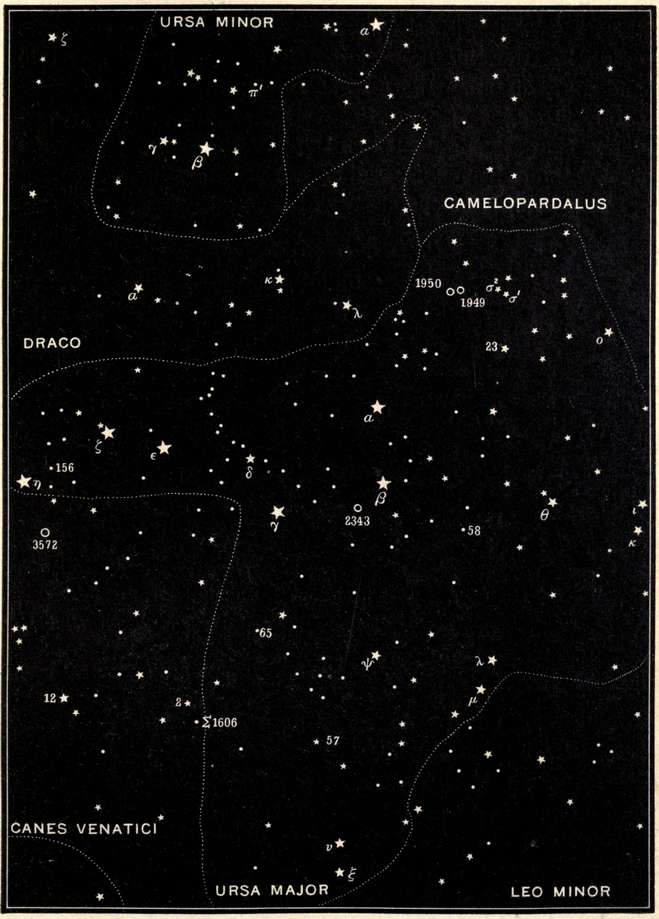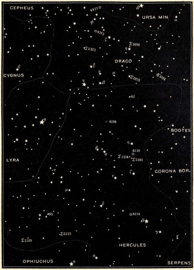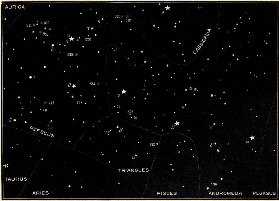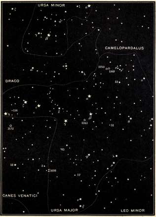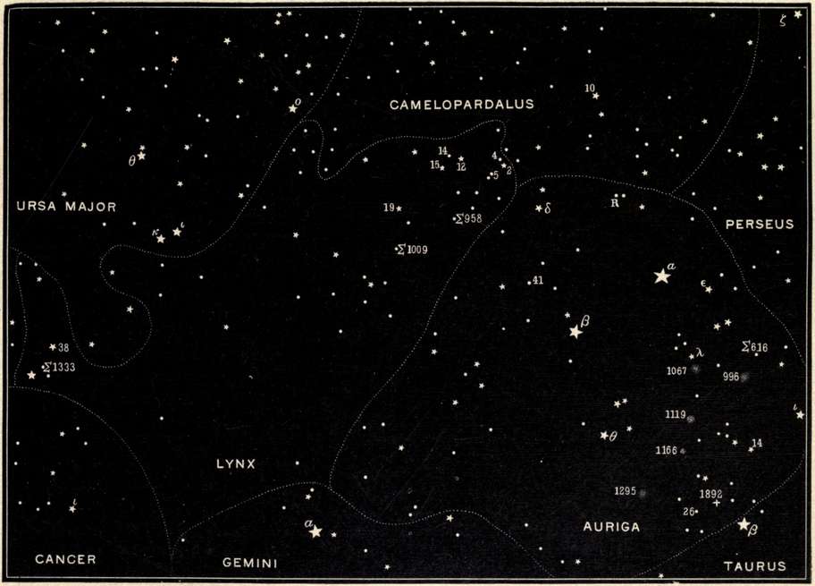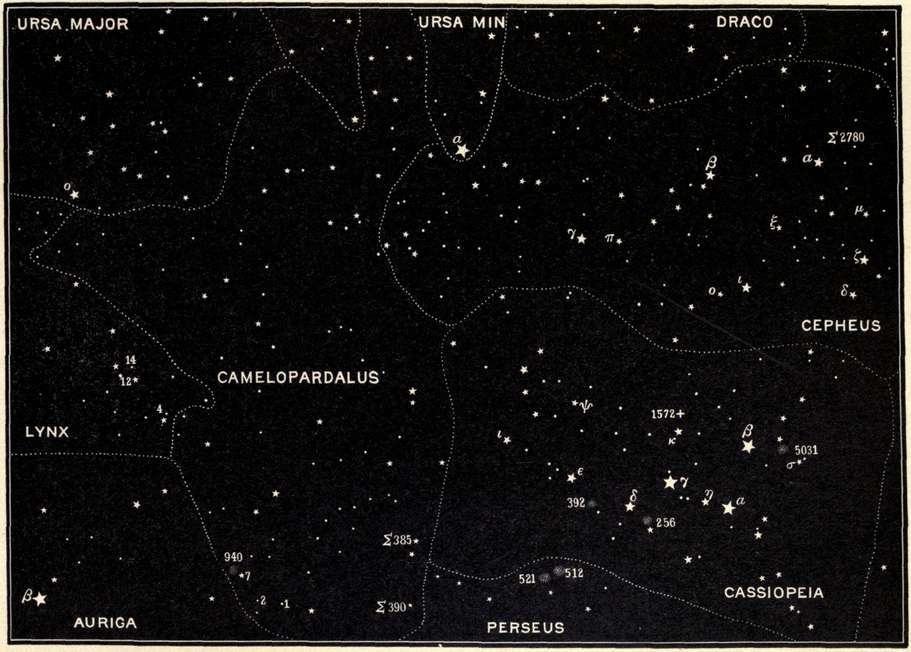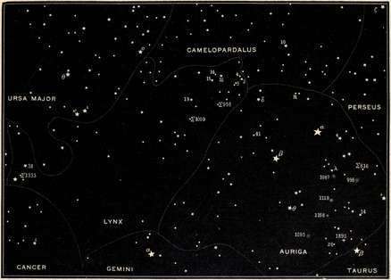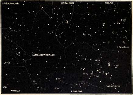 | The first double star ever discovered, the Pleiades and their photographic wonders, the Royal Family of the Sky, Andromeda, Cassiopeia, Perseus and Cepheus, Ursa Major, Camelopardalus, Ursa Minor, and the Pole Star. | |