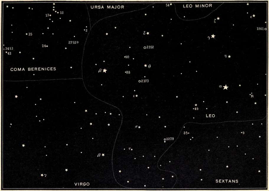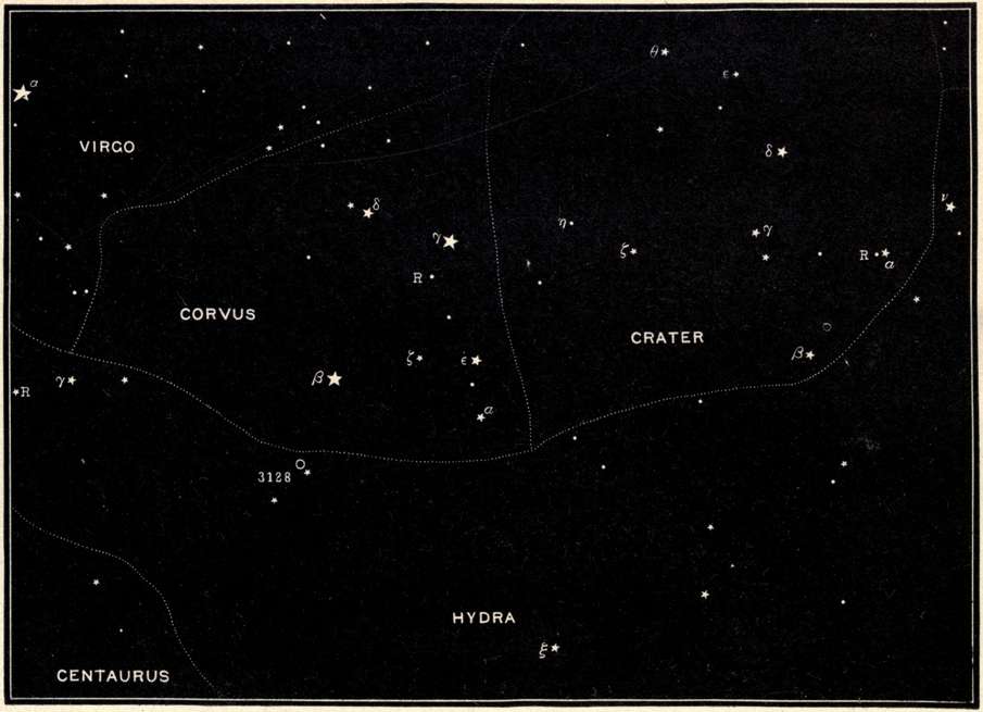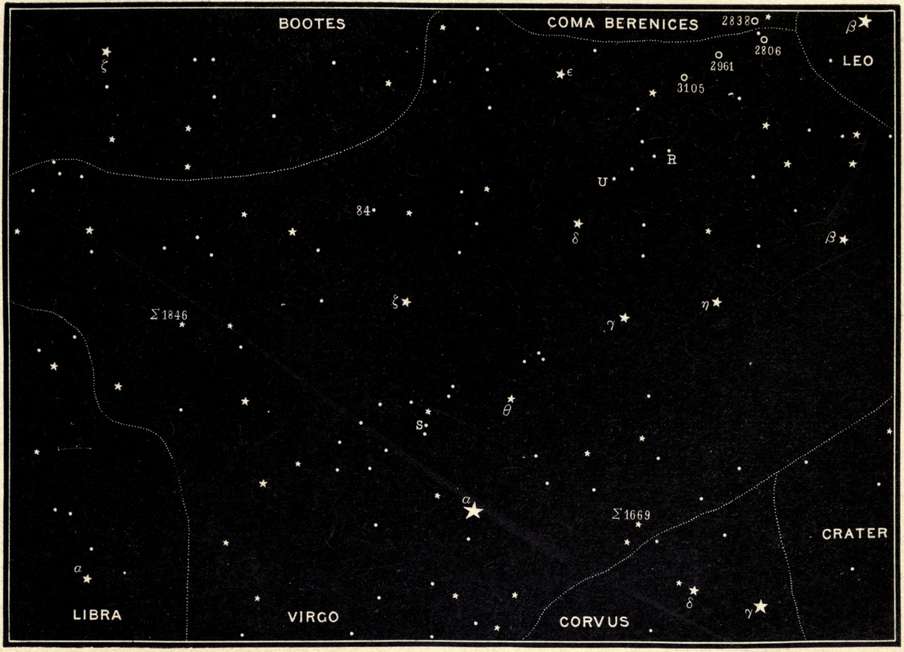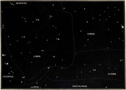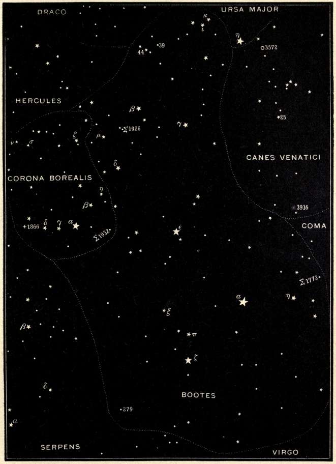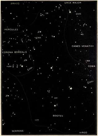 | Crater and Corvus, Hydra, Virgo, the "Field of the Nebulæ," Libra, Boötes, and the great Arcturus, Canes Venatici, and Corona Borealis. | |