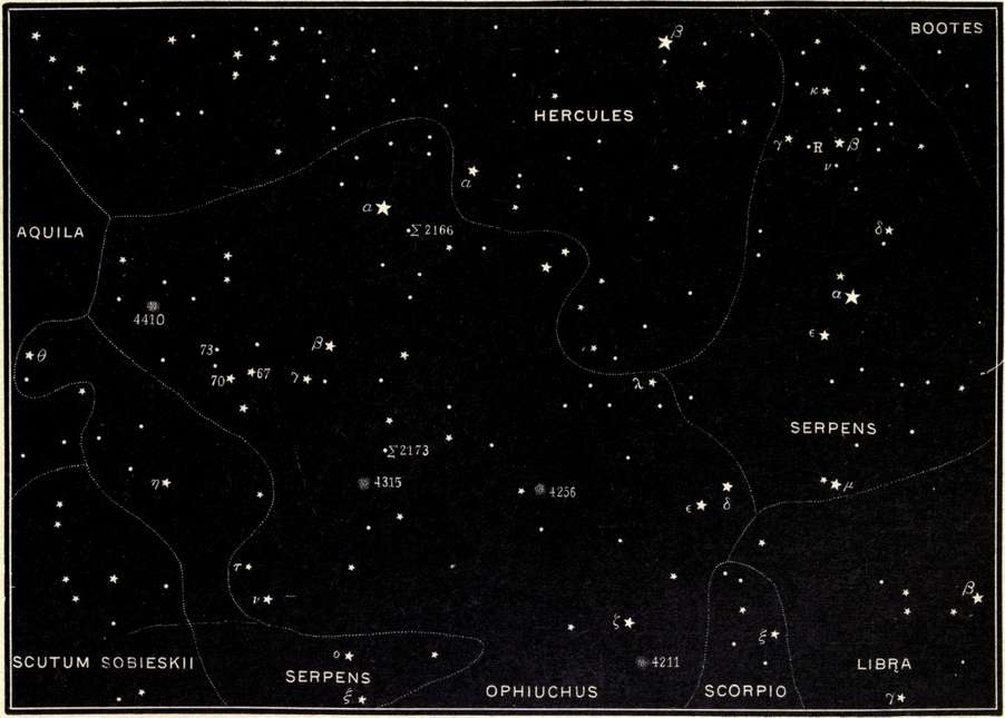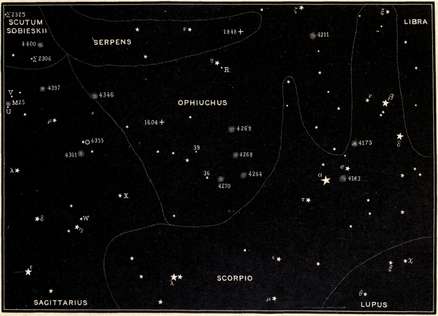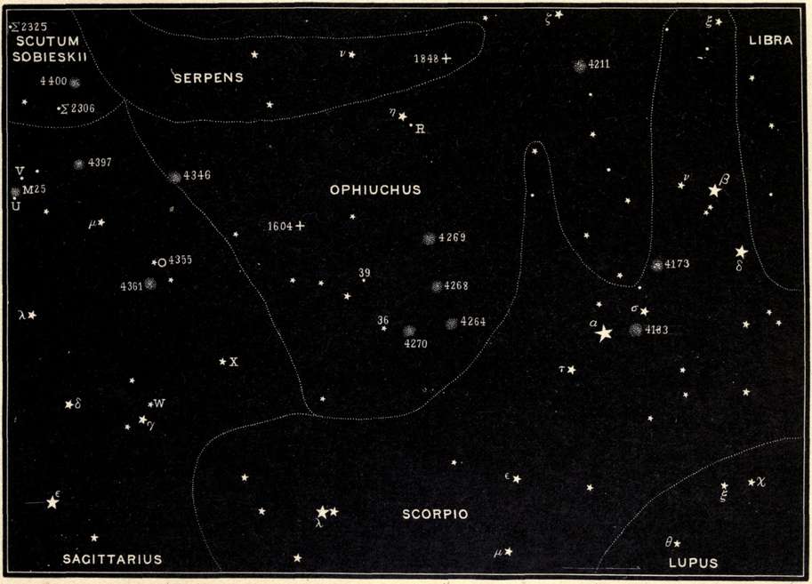 By the introduction of a complete series of star maps, drawn specially for the use of the amateur and distributed through the body of the work, thus facilitating consultation, it is believed that this book makes a step in advance of its predecessors. The maps show all of the stars visible to the naked eye in the regions of sky represented, and, in addition, some stars that can only be seen with optical aid. The latter have been placed in the maps as guide posts in the telescopic field to assist those who are searching for faint and inconspicuous objects referred to in the text. As the book was not written for those who possess the equipment of an observatory, with telescopes driven by clockwork and provided with graduated circles, right ascensions and declinations are not given. All of the telescopic phenomena described are, however, represented in the maps. Star clusters are indicated by a conventional symbol, and nebulæ by a little white circle; while a small cross serves to mark the places where notable new stars have appeared. The relative magnitudes of the stars are approximately shown by the dimensions of their symbols in the maps, the smaller stars being represented by white dots and the larger by star-shaped figures.