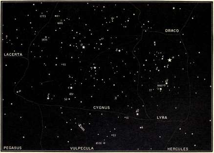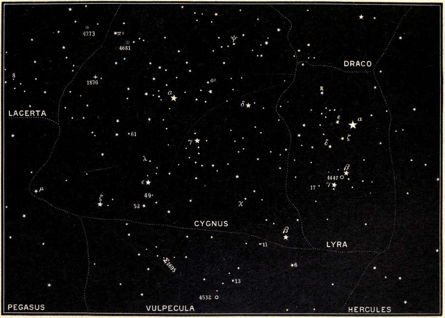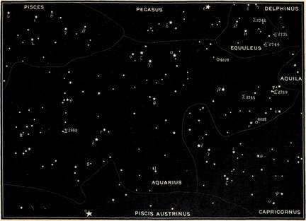 | Lyra and its brilliant Vega, Cygnus, Vulpecula, Aquarius, Equuleus, Pegasus, Cetus, and Eridanus. | |