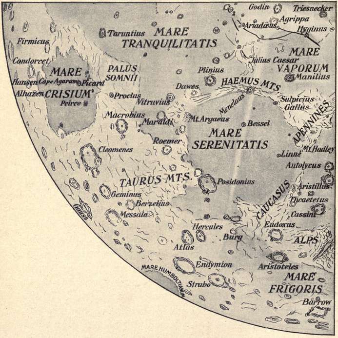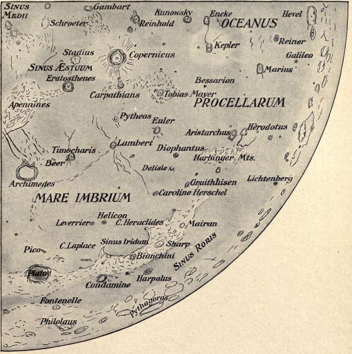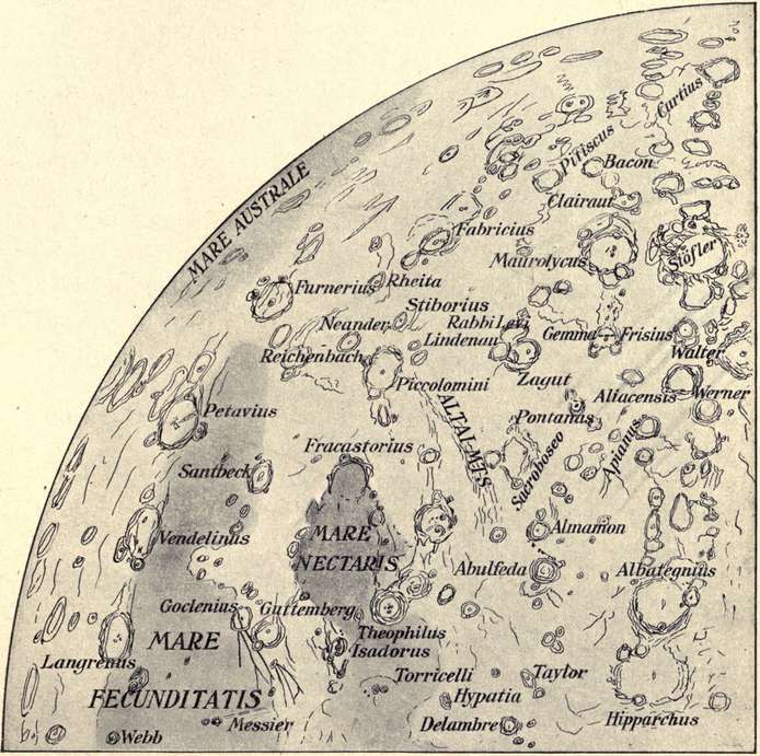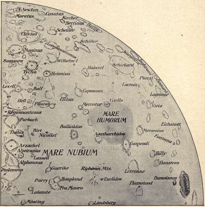 In the lunar charts the plan of inserting the names of the principal formations has been preferred to that usually followed, of indicating them only by numbers, accompanied by a key list. Even in the most detailed charts of the moon only a part of what is visible with telescopes can be shown, and the representation, at best, must be merely approximate. It is simply a question of what to include and what to omit; and in the present case the probable needs of the amateur observer have governed the selection—readiness and convenience of reference being the chief aim.