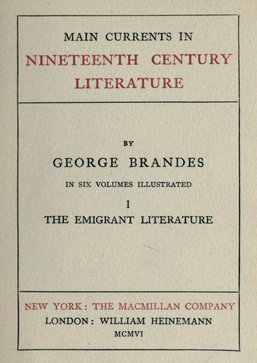 The literary history of a whole continent during half a century obviously does not begin at any one single point. The point of departure chosen by the historian may always be described as arbitrary and fortuitous; he must trust to his instinct and critical faculty, or he will never make a beginning at all. To me the Emigrant Literature seemed the natural starting-point indicated by history itself. Looked at from one point of view, this group prepares the way for the later religious and political reaction in French literature; looked at from another, it prepares the way for the Romantic School in France. It is the best of introductions to the study and understanding of the Romantic School in Germany; it has even points of contact with such remote phenomena as Byron and Balzac.