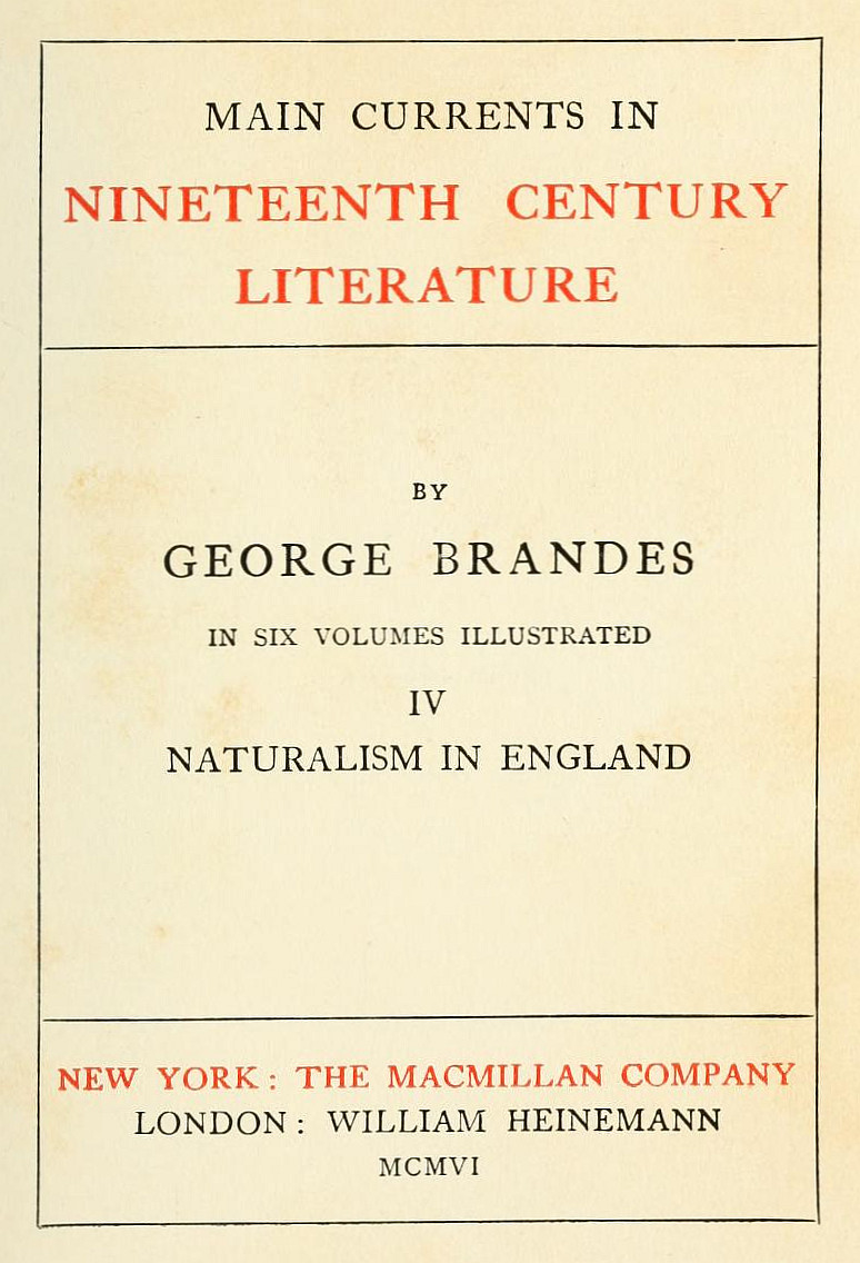 It is my intention to trace in the poetry of England of the first decades of this century, the course of the strong, deep, pregnant current in the intellectual life of the country, which, sweeping away the classic forms and conventions, produces a Naturalism dominating the whole of literature, which from Naturalism leads to Radicalism, from revolt against traditional convention in literature to vigorous rebellion against religious and political reaction, and which bears in its bosom the germs of all the liberal ideas and emancipatory achievements of the later periods of European civilisation.