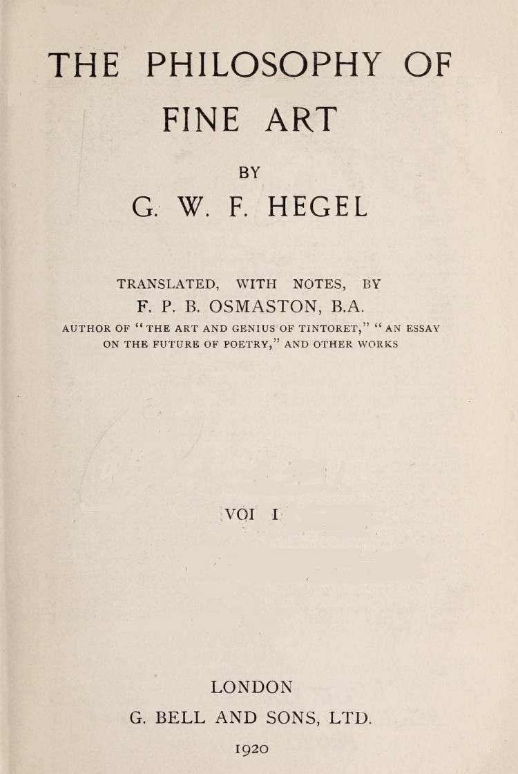 The translation of Hegel's "Aesthetik" or "Philosophy of Fine Art," which is contained in the four volumes of the present work, is the first complete translation in English of the three volumes devoted to this subject in the collected edition (Berlin, 1835). I know of four partial translations in English of this work and one in French. These are Mr. W. M. Bryant's translation of Part II[1], Mr. Kedney's short analysis of the entire work[2], Mr. Hastie's translation of Michelet's short "Philosophy of Art[3]," prefaced by Hegel's Introduction, partly translated and partly summarized and lastly Professor B. Bosanquet's complete translation of Hegel's first Introduction with notes[4].