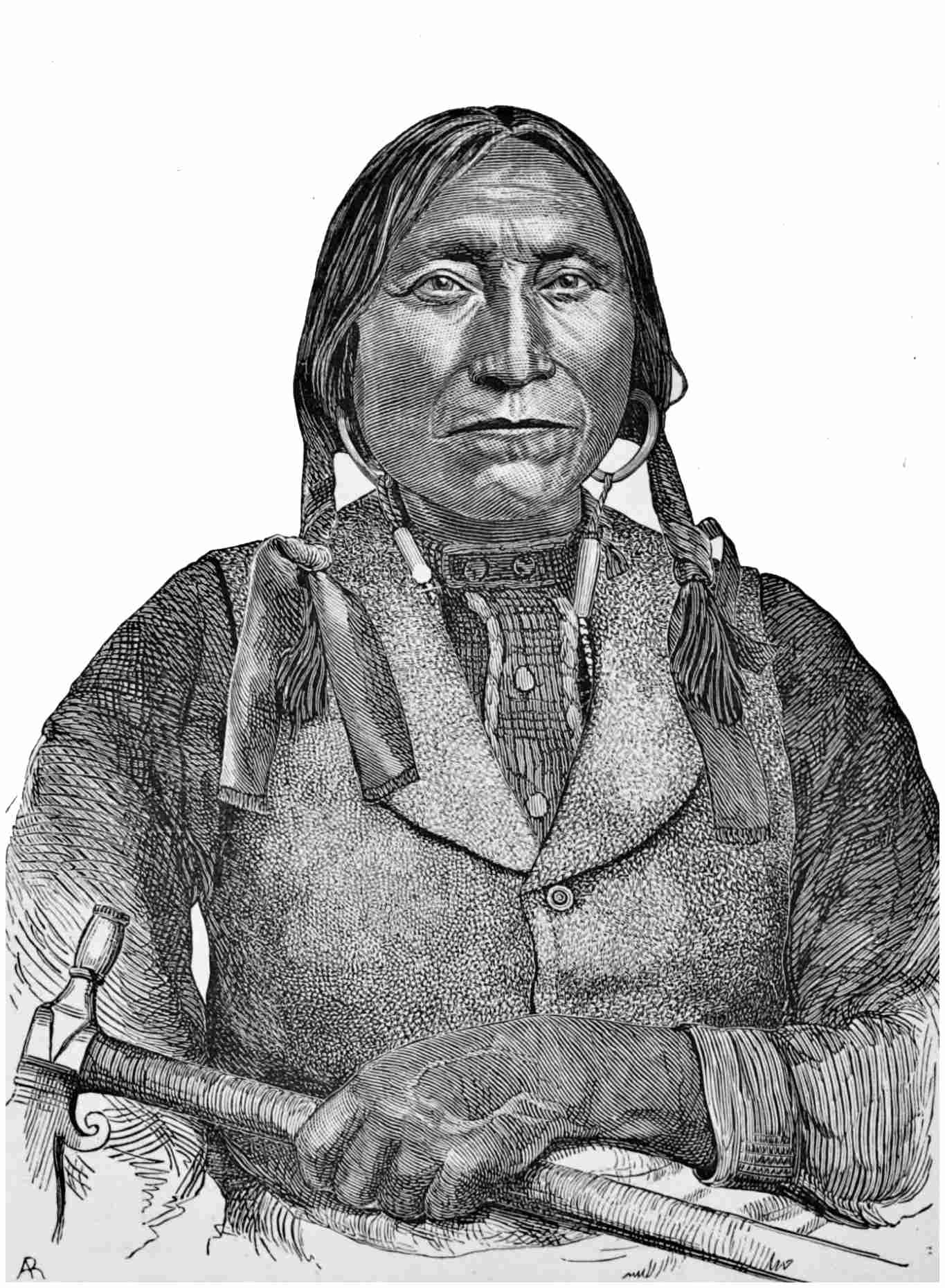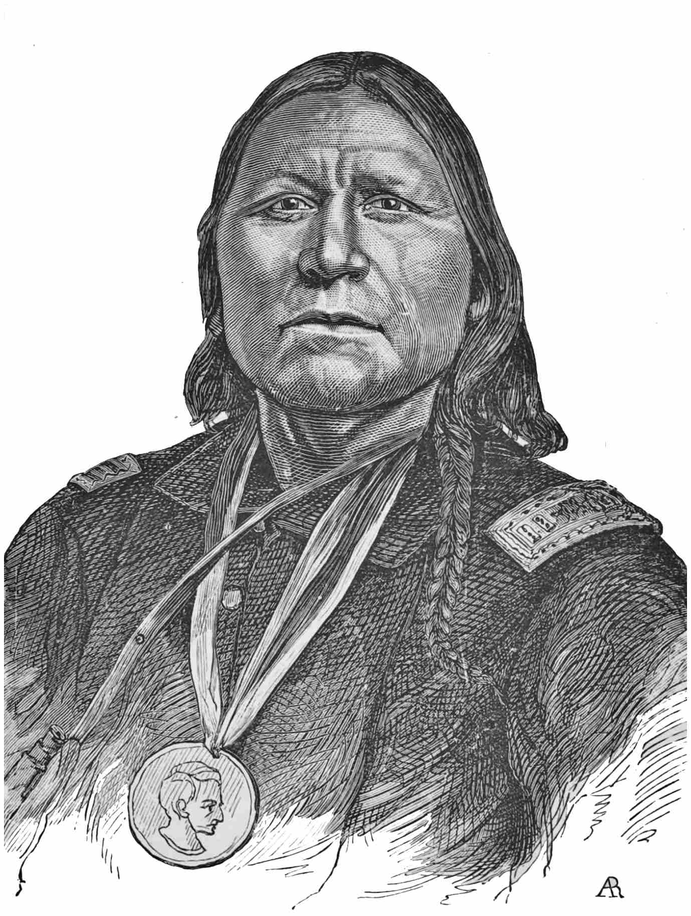 While engaged in shaking hands with him and his companions, and exchanging the usual salutation, “How,” with the new arrivals, I observed that the Indians who had been occupying a retired position had joined the group, and I found myself in the midst of about twenty chiefs and warriors. Medicine Arrow exhibited the most earnest desire to learn from me the number of troops following me. Whether this question was prompted by any contemplated act of treachery, in case my followers were few in number, or not, I do not know. But if treachery was thought of, the idea was abandoned when I informed him that my followers numbered fifteen hundred men, the advance guard being then in sight. Medicine Arrow then informed me that his village was near by, and that the women and children would be greatly excited and239 alarmed by the approach of so large a body of troops. To give assurance to them he urged me to accompany him to his village in advance of the troops, and by my presence satisfy his people that no attack upon them would be made. This I consented to do.