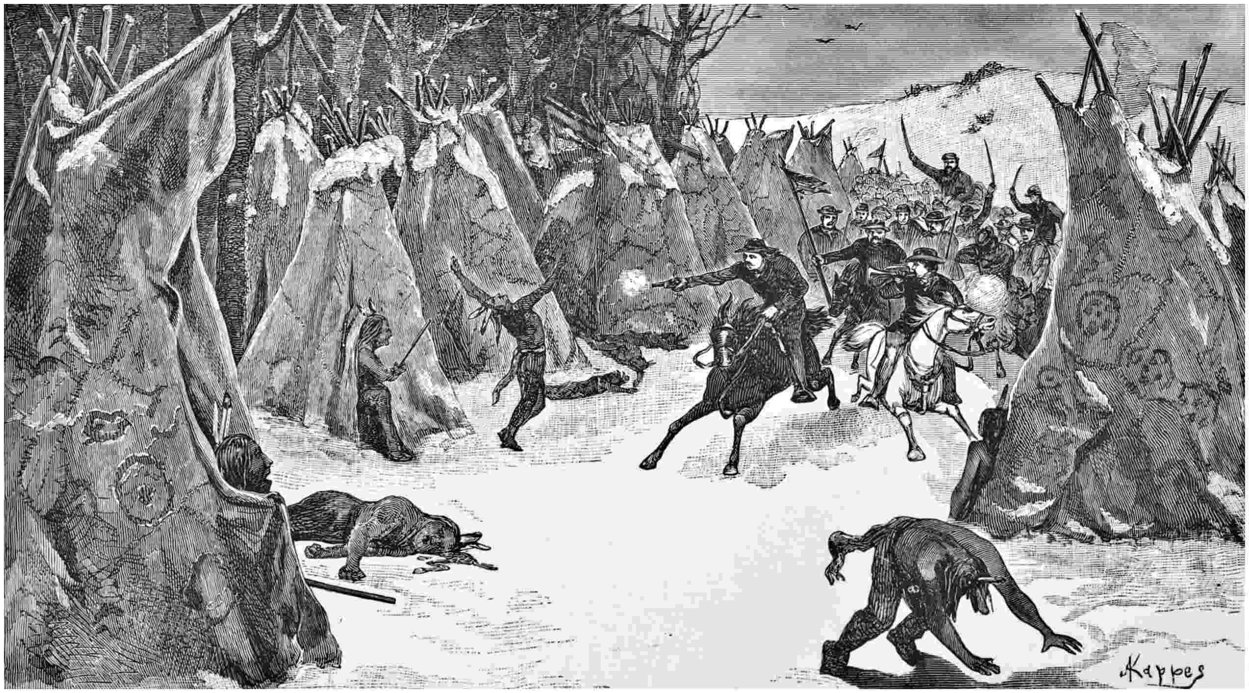 Quickly the words “Saddle up” flew from mouth to mouth, and in a marvellously brief time officers and men were in the saddle and, under the guidance of the Osage scouts, were moving stealthily to surprise the Indian camp. Passing around a little spur of the dividing ridge, there before us, at a distance of but a few hundred yards, stood the half-erected lodges of the Indians, while scattered here and there in the immediate vicinity were to be seen the Indian ponies and pack animals, grazing in apparent unconsciousness of the close proximity of an enemy. At a given signal the cavalry put spurs to their steeds, drew their revolvers, and in a few moments were in possession of the Indian camp, ponies and all—no, not all, for not a single Indian could be discovered.