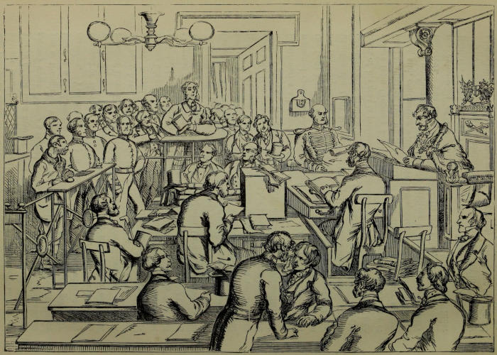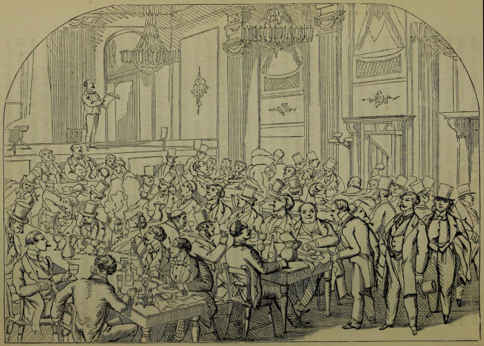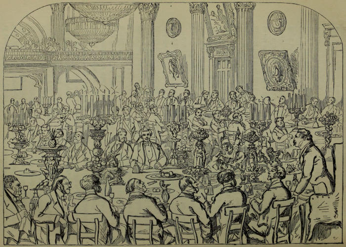 [7] The ladies appear in the gallery before dinner, quit it after grace has been said, and are regaled in ante-chambers with ices, coffee, and champagne. They return when the speech-making, wine-bibbing, and song-singing commence.