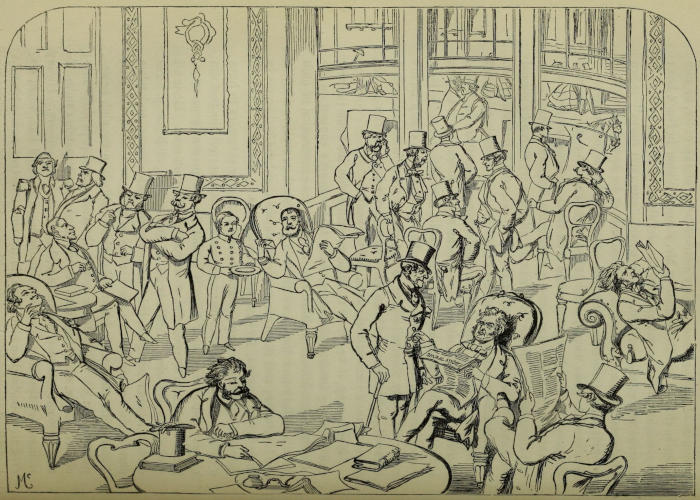 This iracund journalist—to borrow an epithet from Mr. Carlyle—is not by any means solitary in his patronage of the marble-tabled, portrait-hung café. To tell the honest truth, as, in Paris, if you wish to see the actors in vogue, you must go to the Café du Vaudeville—if the authors, to the Café Cardinal or the Café du Helder—if the artists, to the Café des Italians—if the students, to the Café Belge—and if the dandies, to the Café de Paris; so in London, if you wish to see the wits and the journalist men about town of the day, you must go to Evans’s about one o’clock in the morning. Then those ineffables turn out of the smoking-rooms of their clubs—clique-clubs mostly—and meet on this neutral ground to gird at one another. Autres temps, autres mœurs. A century since it used to be Wills’s or Button’s, or the Rose; now it is Evans’s. I should dearly like to draw some pen-and-ink portraits for you of the wits as they sit, and drink, and smoke, at one o’clock in the morning; but I dare not. As for[345] Thersites Theorbo, he is a shadow. You know what I told you about clubs; and this place also is a prison-house to me. It is true, Heaven help me, that I am not affiliated to witcraft myself, that I am neither priest nor deacon. Still I have been one of the little boys in red cassocks, who swing the censers, and I dare not reveal the secrets of the sacristy. But I may just whisper furtively in your ear, that Ethelred Guffoon is never seen at Evans’s. It makes his head ache. Mr. Goodman Twoshoes, also, is but a seldom visitor to the Cave of Harmony. He prefers his snug corner-box at the Albion, where he can brew his beloved ginger-punch. It is not that the wits despise the “Cave.” Mr. Polyphemus, the novelist, not unfrequently condescends to wither mankind through his spectacles from one of the marble tables; and I have seen the whole “Times” newspaper—proprietors, editors, special correspondents, and literary critics—hob-nobbing together at—— Will you hold your tongue, sir?