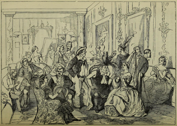 What shall I say of the moving, living, kaleidoscope, twinkling and coruscating in the vast enceinte? Indeed, it is very difficult to say anything a bout the outward similitude of a bal masqué that has not been said a hundred times before. You have taken for granted the very considerable admixture of plain evening costume, worn by the swells et autres, which speckles the galaxy of gay costumes with multitudinous black dots. After this, we all know what to expect, and whom to find. Paint, patches, spangles, and pearl-powder, tawdry gold and silver (more brassy and pewtery, rather, I opine), and sham point lace. Sham fox-hunters, mostly of a Hebrew cast of countenance, in tarnished scarlet coats, creased buckskins, and boots with tops guiltless of oxalic acid, brandishing whips that have oftener been laid across their own shoulders than on the flanks of the “screws” they have bestridden; and screening their mouths with palms covered by dubious white kid gloves, or with bare dirt-inlaid knuckles protuberant with big rings of mosaic jewellery, shouting “Yoicks,” and “Hark-away,” in nasal accents. Undergraduates, in trencher caps and trailing gowns, worn by jobbernols, who know far more about Oxford Street than the University of Oxford. Barristers, more likely to be pleaded for than to plead. Bartlemy-Fair Field Marshals, in costumes equally akin to his who rides on the lamentable white horse before the Lord Mayor’s gingerbread coach, and Bombastes Furioso in the farce. Charles[384] the Seconds, with all the dissolute effrontery of that monarch, but of his wit or merriment none. Red Rovers and Conrad Corsairs, whose nautical adventures have been confined to a fracas on board a penny steamboat; Albanian, and Sciote, and Suliote Chiefs, with due fez, kilt, yataghan, and lambrochines, in orthodox “snowy camise and shaggy capote,” and who act their characters in a likelier manner than their comrades, for they are, the majority, arrant “Greeks.” A few Bedouin Arabs—a costume picturesque yet inexpensive: a pen’north of Spanish liquorice to dye the face withal; a couple of calico sheets, for caftan and burnous, with the tassel of a red worsted bell-pull or so to finish off with, and you have your Abd-el-Kader complete. Half-a-dozen Marquises, of Louis the Fifteenth’s time. Plenty of Monks: robes and cagoules of gray linen, a rope for a girdle, a pennyworth of wooden beads for a rosary, and slippers cut down into sandals—these are as cheap as effective. A Knight, in complete armour (pasteboard with tin-foil glued thereupon); a Robinson Crusoe, always getting into piteous dilemmas, with his goatskin (worsted) umbrella; a Bear, a Demon, and a Chinese Mandarin. When I have enumerated these, I find that I have noticed the travestisements most prevalent among the English male portion of the costumed mob. But there is another very appreciable element in these exhibitions: the foreign one. A century has passed since Johnson told us, in his mordant satire of “London,” that England’s metropolis was—
