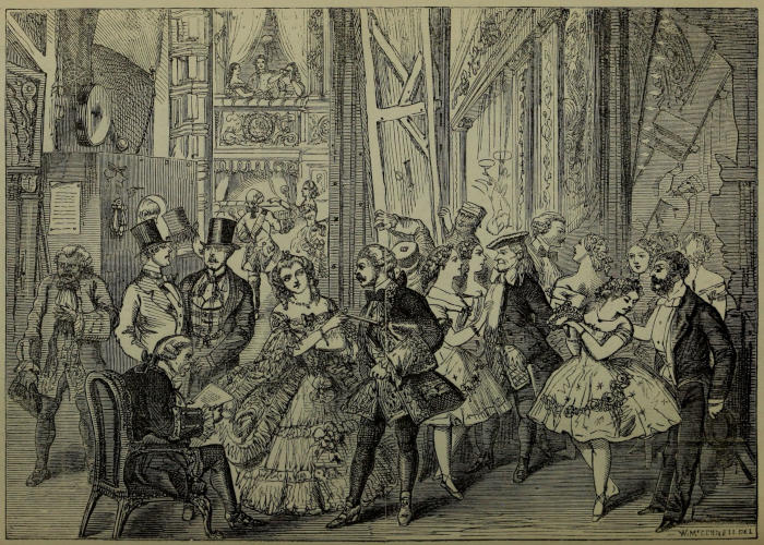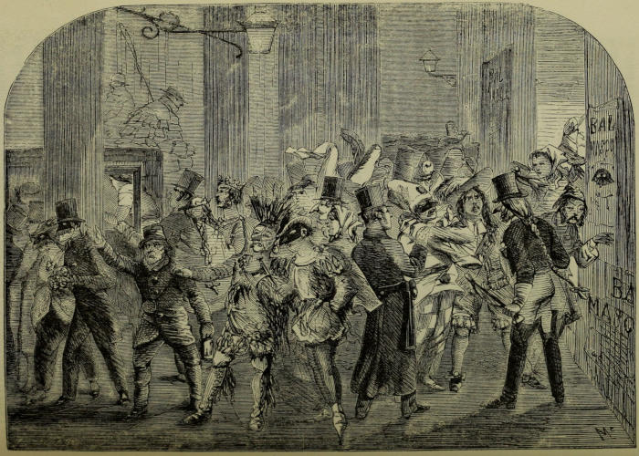 It is by no means incompatible, I hope, with the broad line of argument I have striven to adopt in these papers, if I honestly declare that the tableau I am about to describe has not in any way my approval, nay is, in many respects, much to be reprobated and deplored. I describe it—in its least repulsive details—simply because it is a very noticeable feature in modern London life. To have passed it over would have been dishonest and hypocritical, and I set it down in my catalogue of subjects at the outset of my task, actuated then, as I am now, by a determination to allow no squeamishness to interfere with the delineation of the truth—so long as that truth could be told without offence to good manners and in household language. A modern masquerade in London is, to tell the honest truth, anything but an edifying spectacle. There is certainly no perceptible harm in some hundreds of persons, of both sexes, accoutred in more or less fantastic dresses, meeting together in a handsome theatre, and, to the music of a magnificent band, dancing till three or four o’clock in the morning. But the place is not harmless: people go there to dissipate, and do dissipate. The salle de danse of a grand masquerade is a re-union of epicurean passions—an epitome of vice painted and spangled. And I take a masquerade triumphantly as an argument against the precisians and sour-faces, who would curtail the amusements of the people, and viciously thwart them in their every effort to amuse themselves. Look you here, gentlemen of the vestry—arch moralists of the parish! look you here, good Mr. Chaplain of Pentonville, who have got your pet garotter safe in hold for his sins! This is no penny-gaff, no twopenny theatre, no cheap concert or dancing[378] academy—not so much as a “free-and-easy” or a “sixpenny hop.” Shopboys don’t rob the till to come to a bal masqué at her Majesty’s Theatre. Your pet garotter didn’t throttle the gentleman in the Old Kent Road in order to procure funds to dance with Mademoiselle Euphrosine de la Galette, of the Rue Nôtre Dame de Lorette, Paris, and attired in a ravishing débardeur costume. There is, to be sure, a floating population of Bohemians—citizens of the world of London, belonging to the theatres, enfants perdus of the newspaper press, and so on, who are admitted gratis to a masquerade: these last Zouaves of social life, have free admission to coroners’ inquests, public dinners, ship launches, private views of picture exhibitions, night rehearsals of pantomimes, and royal marriages. The modern newspaper man is, in print, the embodiment of Mr. Everybody; in private he is Mr. Nobody, and doesn’t count at all. Lord Derby is afraid of the journalist in print, but in the flesh his Lordship’s footman would look down upon him. “Honly a littery man, let him knock agin,” Jeames would say. So we go everywhere, even as though we were in the “receipt of fern seed.” Even the House of Commons has invented a pleasant fiction for the benefit of the gentlemen of the press, and humorously ignores their presence during the debates. The Empress Julia bathed before her male slave. “Call that a man,” she cried, contemptuously. In the like manner, no account is taken of the journalist’s extra card of admission or extra knife and fork. He goes under the head of “sundries,” though he makes sometimes a rather formidable figure in the aggregate.