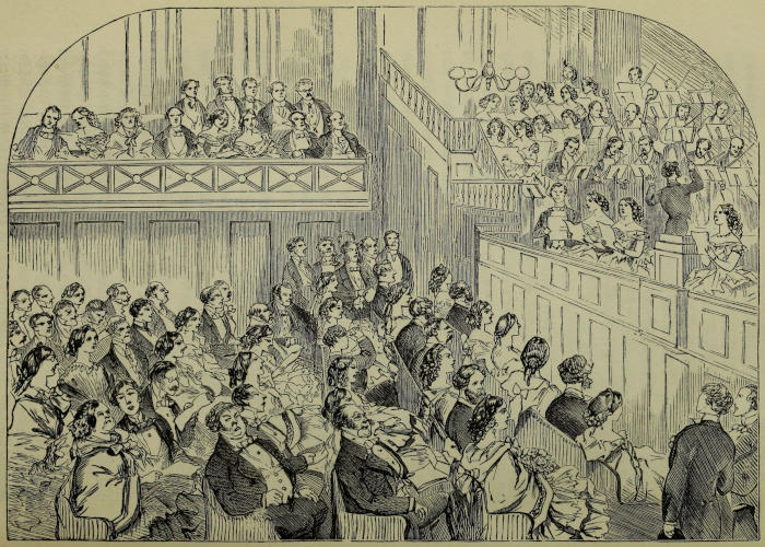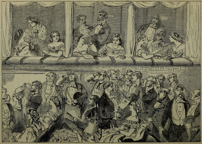 Stand we in the orchestral hemicycle, and watch the garish, motley scene. Questions of morality apart, one must have jaundiced eyes to deny that, as a mere spectacle, it is brilliant and picturesque enough. All that M. Jullien’s bizarre taste and fancy could suggest, or the cunning skill of experienced scenic decorators carry out, has been done here to make the place gay, dazzling, and effective. Wreaths of artificial flowers, reflecting the highest credit upon the paper-stainer and the paper-cutter’s art, mask the somewhat fanées ornaments of the tiers of boxes; homely corridors and staircases are pleasantly disguised under a plentitude of scarlet baize and drugget; the chandelier is of abnormous size, for any number of glittering festoons have been added to its crystal abacot; devices in glass and devices in gas twinkle and radiate on every side: nor is music’s voluptuous swell wanting to incite us to “chase the glowing hours with flying feet,” and make all things go “merry as a marriage bell.”
