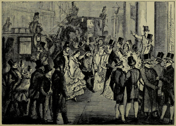A stream of masquerading humanity, male and female, begins to pour through the corridors and so out beneath the portico. It is time. Cabs and broughams—the “swells” came in the broughams—sly, wicked little inventions; policemen hoarsely shout and linkmen dart about.