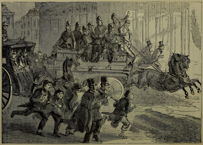 “Fire! fire!” It matters not how late the hour be, how important the avocations of the moment, that magic cry sets all legs, save those of the halt and the bed-ridden, in motion—strikes on every tympanum. “Fire! fire!” as the sound rolls earwards, the gambler starts up from the dicing-table, the bibber leaves the wine-pots, the lover rises from his mistress’s feet, the blushing maiden forgets half of that last glowing declaration, the captive runs to his grated window, the sluggard sits up on his couch, the sick man turns his head[347] on his pillow to whence issues the portentous cry. Hundreds of impulses are bound up in the uncontrollable desire that prompts us to run at once after the “Fire!” Fear: it may be our own premises that are blazing, our own dear ones that are in peril. Hope and cupidity: we may be rogues, and there may be rich plunder from a fire. Duty: we may be policemen, firemen, or newspaper reporters. Generous emulation, brave self-devotion: there may be lives at stake and lives to save. Curiosity: it is as good to see a house burned (when it doesn’t happen to be your own) as a bear baited or a man hanged. All these may prompt us to follow the howl of the fire-dogs; but, chiefest of all, is the vague, indefinite, yet omnipotent desire to swell a pursuing crowd, to join in a hue and cry, to press to the van of the chasers: to hunt something, in fact.