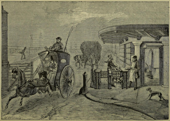Which never sleeps! Morning, and noon, and night, the sharp, clicking turnstile revolves; the ever-wakeful tollman is there, with his preternaturally keen apron. I call this man Charon, and the river which his standing ferry bridges over might well be the Styx. Impossible, immobile, indifferent, the gate-keeper’s creed is summed up in one word—“A halfpenny!” Love, hope, happiness, misery, despair, and death—what are they to him? “A halfpenny for the bridge” is all he asks! but “a halfpenny for the bridge” he must have.