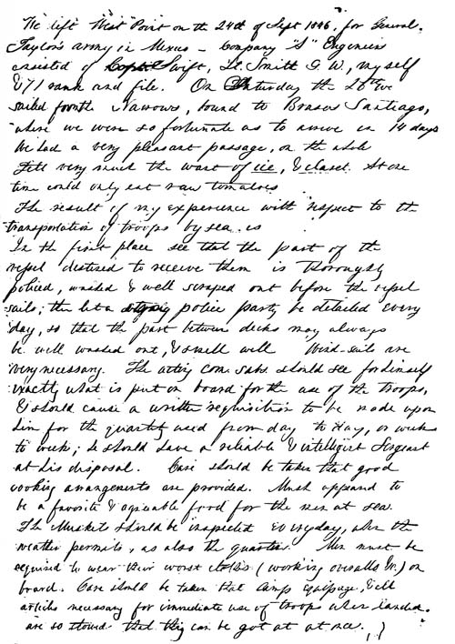 We left West Point on the 24th of September 1846 for General Taylor’s army in Mexico—Company “A” Engineers[1] consisted of Captain [A. J.] Swift, Lieutenant G. W. Smith,[2] myself and 71 rank and file. On Saturday the 26th we sailed from the Narrows bound to Brazos de Santiago [Texas] where we were so fortunate as to arrive in 14 days. We had a very pleasant passage, on the whole. Felt very much the want[8] of ice, and claret. At one time could only eat raw tomatoes.