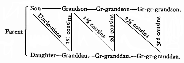 For obvious reasons it will often be impossible to distinguish between the different degrees of consanguinity, but wherever possible the degree will be specified. It is probable that where a number of marriages are vaguely given as consanguineous, few are more distant than second cousins, for in the United States especially, distant relationships are rarely traced except by genealogists. In designating degrees of relationship the common terminology will be used, as in the following table, expressing, however, the rather clumsy expression, "first cousin once removed" by the simpler form "1-1/2 cousin."