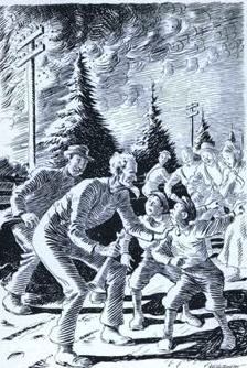 The heat was intense, blistering. Reluctantly the crowd, awed and fascinated by the greatest blaze it had ever seen,—not even excepting the burning of Eliphalet Loop's straw-ricks in 1897,—edged farther and farther away, pursued by the relentless heat-waves. The fire-fighters withdrew in good order, obeying the instinct of self-preservation somewhat in advance of the command of their superior, who, indeed, had anticipated such a man[oe]uvre by taking a position from which he could lead the retreat. By the time the fire was at its height, "lighting the way clear to heaven," according to Miss Sue Becker, who had to borrow Marshal Crow's pencil and a piece of paper from Mort Fryback so that she could jot down the beautiful thought before it perished in the "turmoil of frightfulness!"