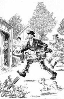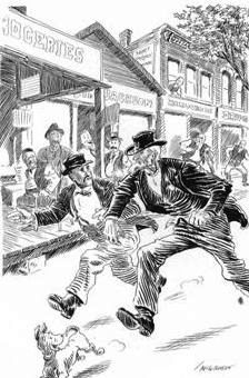 For one who had never laid eyes on the village of Tinkletown up to the day of his arrival, Jake Miller revealed the most astonishing sense of civic pride. The first thing he did after being safely locked up was to whitewash the interior of his residence. (The town board furnished a rather thin mixture of slaked lime and water, borrowed a whitewash brush from Ebenezer January, and got off with a total cost of about eighty-five cents.) He also repaired several windows in the calaboose by stuffing newspapers into the broken panes, remodeled the entire heating system with a little stove polish, put two or three locks in order, and once, on finding that it was possible to remove a grating from one of the windows, crawled out of his place of confinement and mowed the grass plot in front of the jail.