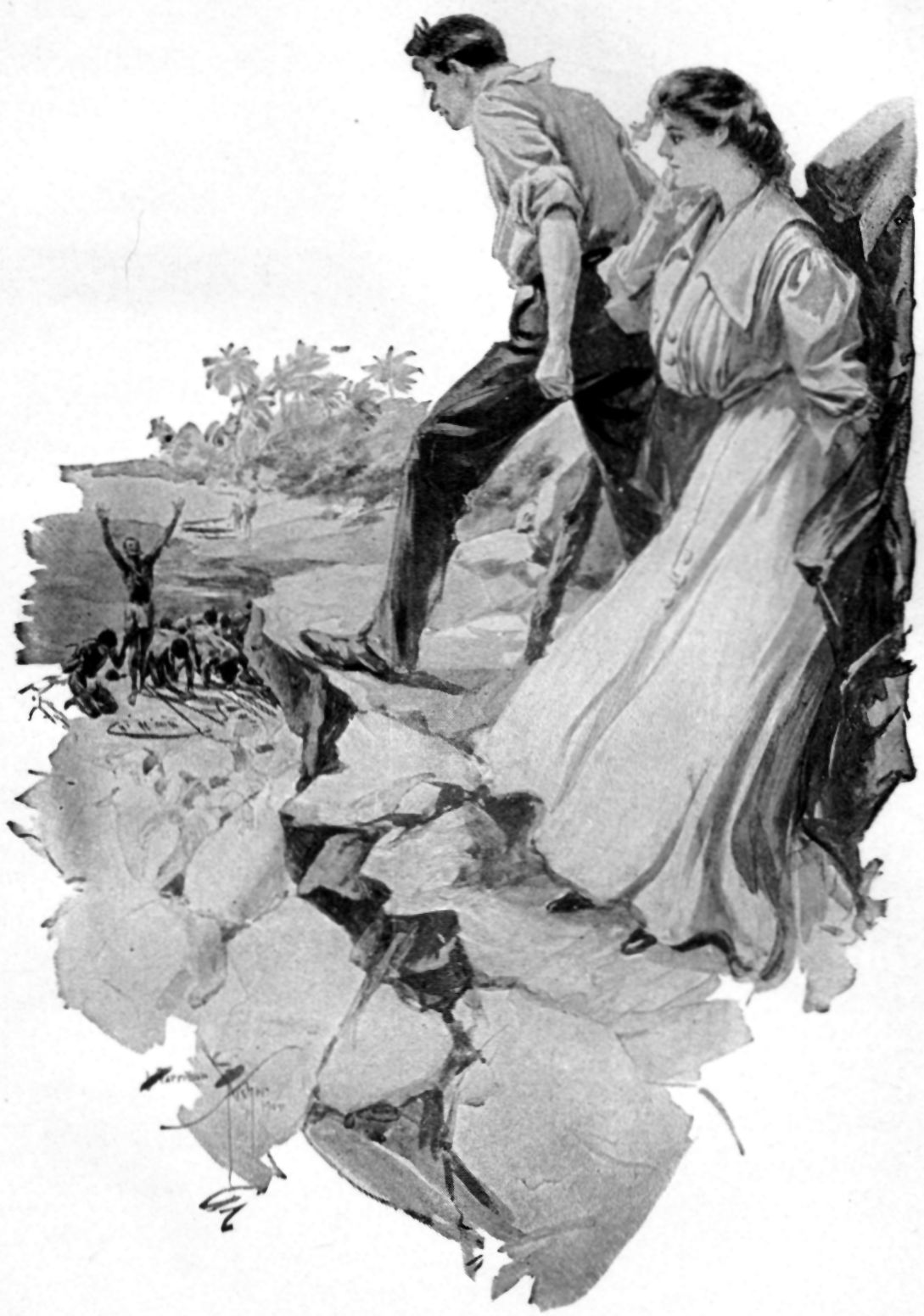 "Oh, Hugh, Hugh," the girl moaned, putting her hands over her face, even as he clasped her awkwardly, half-heartedly in his arms. He was saying distressedly to himself: "She loves me! I cannot break her heart!"