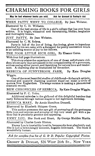 “I know I shall positively hate that child,” said she, overlooking his generous offer. “I will be a real stepmother to her, you mark my words. You can let her come if you want to, Harvey, but you mustn’t expect me to treat her as anything but a—a—an orphan.” She was a bit mixed in her nouns.