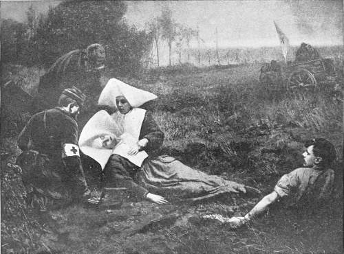 | Twelve Sisters depart for the battlefield from the Mother House at Emmittsburg. A white handkerchief on a stick serves as a flag of truce. An open charnel house red with the blood of American manhood. The little church in the town of Gettysburg filled with the sick and wounded. A Sister saves the life of a helpless man. “I belong to the Methodist Church.” | 132xiv |