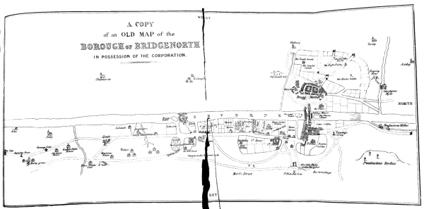 The first thing which naturally engages our attention, in considering the Antiquities of Bridgnorth, is the origin of its name. This, as well as other names just as simple and intelligible, has afforded matter for the ingenious speculations of etymologists, who, by a sort of alchemy, of which they only are the masters, have transmuted it into a form totally different from its own. For instance, some have made it out that the name signifies the tower or castle on Morfe, and that it was originally Burgmorfe, the first syllable of which, “Burg,” being derived from the Greek word πυργος, ‘a tower’, the other being [Pg 2] the Saxon name of the neighbouring forest, which extended over the large district still so called. But it is not easy to conceive, how “Burg” should have been transmuted into “Bridge,” and still less so, how “Morfe” should have been corrupted into “North.” The name is a very plain one, and just as plain is its etymology; Bridgnorth i. e. the north Bridge, or the bridge lying to the north of some other bridge. In every ancient record it is called “Brugge” or “Brug,” the Saxon form of the word “Bridge,” and there is no instance, I am informed, of the syllable “North” being added to it, at least in any public document, earlier than the reign of Edward I. Bridges in early times were not so common as they are now, and therefore a place, which had a bridge or bridges of any size, often took its name from this circumstance. Thus Bruges, a town in Flanders, was so named, from the numerous bridges over the canals, which intersect it; and Bridgetown, near which the famous battle of the Boyne was fought, was so called on account of the bridge, which there crosses the river. So our town [Pg 3] received its first name of “Brug” from the bridge, which here spanned the Severn; and was afterwards called “Bridgnorth,” to distinguish it from a bridge lower down the Severn, at Quatford.[1]