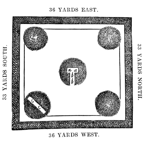 “In July, 1740, I observed upon Morfe the tumuli as above represented, [Pg 6] where the soil is a strong gravel. Mountfaucon tells us that the old Cimbri, [the Danes,] were wont to throw up gravel on their graves, and the more remarkable the persons were, the larger the tumuli over them. I therefore imagined that this might possibly be the burying place of the Danes. For satisfaction, I caused the middle and largest of these tumuli to be dug from north to south, (a.a.) supposing that by that method I might cross the site of the body that may have been laid there. We dug about seven feet deep, even to the solid rock, without meeting anything remarkable but an iron shell, in the shape of an egg, with a round hole at one end; but so cankered and decayed, that it easily broke into small pieces. This we judged to be the boss of a sword. However, on viewing the trench that we had dug, we perceived on the west side of it a hollow in the gravel, which upon trial extended horizontally four or five feet; and under this hollow (b.b.) we found [Pg 7] one of the large vertebræ of the loins, with its processes pretty perfect, but thoroughly petrified; and upon further search, several portions of bones, all alike petrified, but so disguised that we could not discover to what part of the body they belonged. We afterwards opened one of the lesser tumuli, (c.c.) and found what is thought to be the os sacrum, and many other small pieces of bone, in a petrified state. It was great odds that we found nothing at all, but nature favoured us by preserving some few tokens of antiquity.” Mr. Stackhouse seems to have been disturbed in his archeological researches; for he mentions that the people of Bridgnorth flocked in great numbers to the spot, expecting to see great wonders, and to prevent further concourse, he was glad to fill up the trenches, and to leave the other tumuli unexamined.
