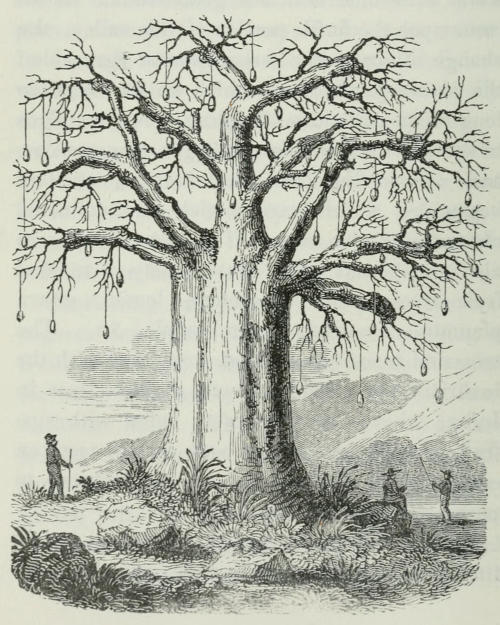Several trees of the Boabab, or monkey bread-tree, (Adansonia digitata,) were now seen, and[22] among them one was particularly conspicuous from its size, as also from a resemblance to the union of three trees. This tree was destitute of foliage, but that loss was compensated by the curious character it assumed, being covered with fruit pending from a long, twisted, spongy stalk, varying in length from one to two feet.[23] This tree measured forty feet in circumference, and was about sixty feet high; the bark was smooth, and of a greyish colour; the termination of its larger branches is remarkable, from being abruptly rounded, and from these rounded extremities the smaller branches are given off, as may be seen in the accompanying drawing; this forms a very characteristic feature in the tree. The fruit, on the outer shell being broken, contained not the yellow pulp usually mentioned, but a white farinaceous substance enveloping the dark brown seeds, of an agreeable acidulated taste. This may proceed from the fruit being old. The fruit is of an oval form, usually six inches in length, and three or four in diameter; rough externally, and, when mature, of a brownish yellow colour; a dark red gum exuded from the outer part of the fruit.[8]