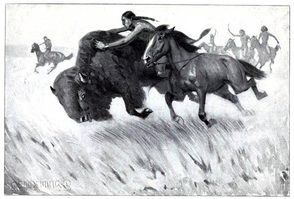 "In the autumn, as soon as the fur began to get good, I used to start out and find a herd of buffalo, and after shootin' two or three of them, I'd skin them down, and rip them up, and put from one to three bottles of strychnine in each carcass. After the blood that lay in the ribs had been poisoned good, I'd smear that over the meat on the outside. 13 Generally I'd try to kill my buffalo close to where I was goin' to camp, and after I had put out my baits I went to camp and slept until near day. Then, before I could see, I'd get up, cook my breakfast, hitch up, if I had a team, and go round to all my baits. Likely, around each one I'd find my half dozen to fifteen wolves, and sometimes it would take me two or three days to skin them. Likely enough, if the weather turned right cold, I got a good many more wolves than I could skin, and had to stack them up, and wait till I got time. It was mighty hard work now, and don't you forget it. Then, too, there was always a chance that Indians might come along and make trouble for me. You take a man out on the prairie, ten years ago, and even the friendly Indians were likely to scare him a whole lot, or take his hides, even if they didn't take away his gun and his horses. As for the hostiles, if they got too close to a man it was all up with him. But I never had no trouble with them, except once, and then I was camped in the dug-out, with plenty of provisions, and there was only three of the Indians. I saw them comin', and suspected who they were, and managed to get my horses into the dug-out with me and stood 'em off. They scared me bad though.