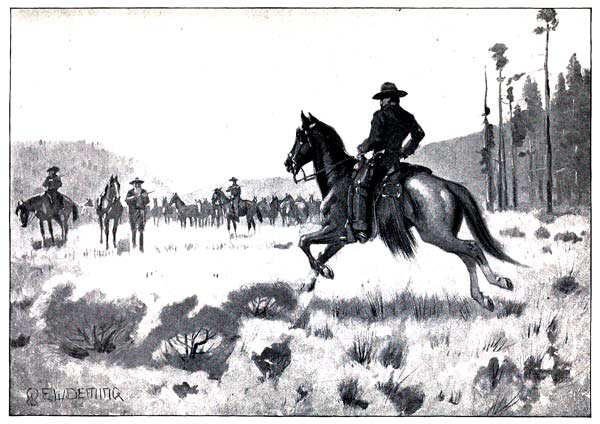 An hour or two of hard, fast riding brought him to the point where he had come upon the trail that morning, and he could see, looking ahead, that here it turned off and struck in toward the hills, apparently to go up one of two valleys. There was water in both,—not much down here on the dry bottom, but further back in the hills and among the timber he knew that these streams were running brooks, and that on both there were wide grassy meadows and places very likely to be chosen by people driving a bunch of horses, in which to stop and let them feed and rest. If he had been following Indians who had driven off a band of horses that they had stolen from an Indian camp, he would have gone carefully, for Indians would have left behind scouts who, from the top of some high hill, would have watched the back trail for at least a few hours; but he did not think that white men would 250 do this. He had reason to think that if these were rustlers—horse thieves—they had gone over the range after the horse round-up was over, and gathering these horses, had driven them slowly, perhaps by night, until they had got beyond the last ranch, and then had hurried them along, hoping to get them out of the country without observation.