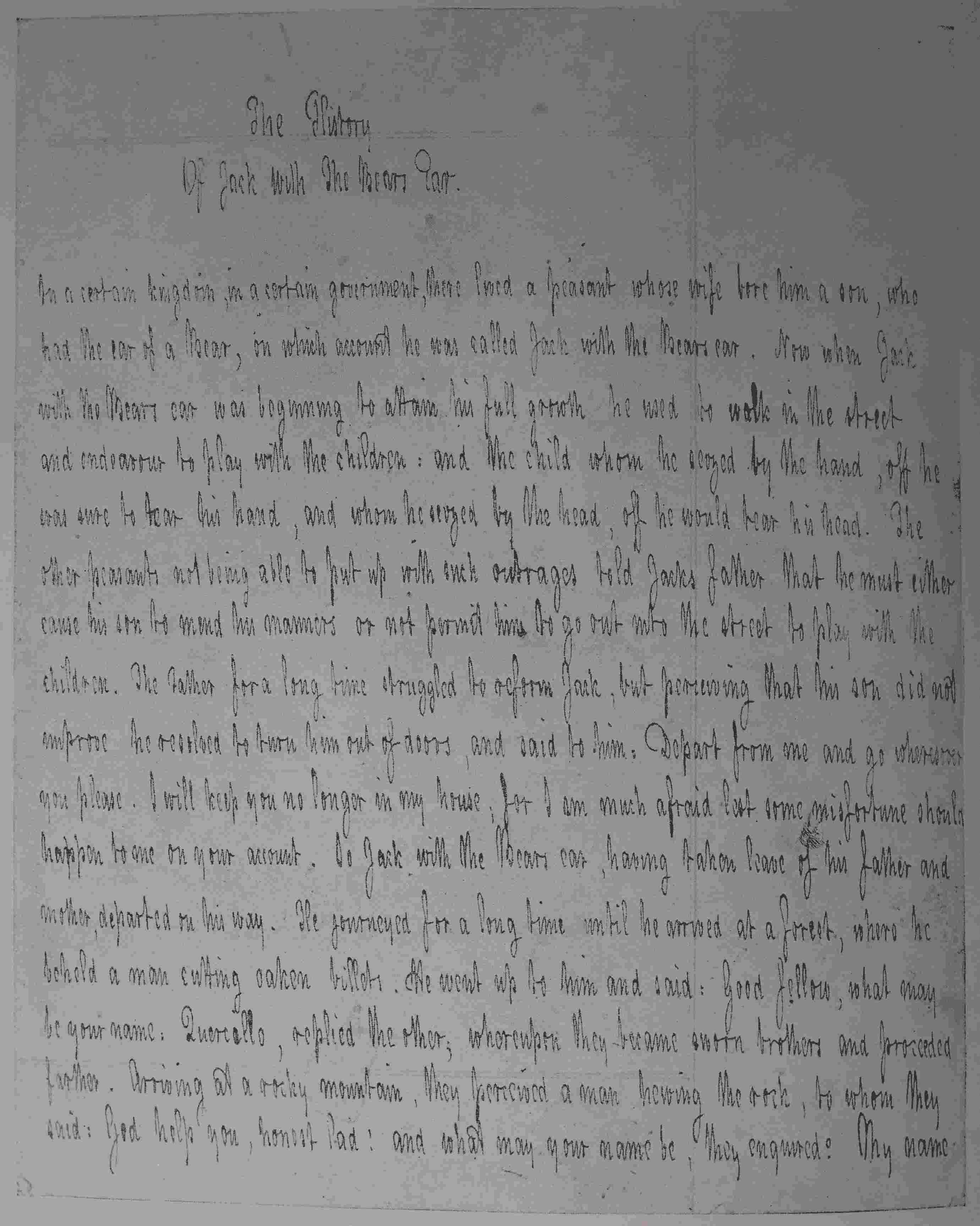 Now when Jack with the Bear’s Ear was beginning to attain his full growth he used to walk in the street and endeavour to play with the children; and the child whom he seized by the hand, off he was sure to tear his hand, and whom he seized by the head, off he would tear p. 12his head. The other peasants, not being able to put up with such outrages, told Jack’s father that he must either cause his son to mend his manners or not permit him to go out into the street to play with the children. The father for a long time struggled to reform Jack, but perceiving that his son did not improve he resolved to turn him out of doors, and said to him: “Depart from me and go wheresoever you please. I will keep you no longer in my house, for I am much afraid lest some misfortune should happen to me on your account.”