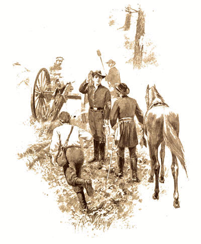 A BATTERY of six twelve-pounder Napoleon guns lay in a little skirt of woodland on the south bank of the Rapidan. It was raining, not violently, but with a soaking persistence that might well have made the artillery-men tired of life and ready to welcome whatever end that day’s skirmishing might bring to the weariness of living. But these men were veteran soldiers, inured to hardship as well as to danger. A saturating rain meant next to nothing to them. A day’s discomfort, more or less, counted not at all in the monotonously uncomfortable routine of their lives.