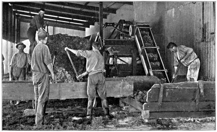 Grape-crushing by machinery at Seppeltsfield. The Grapes from which Australian Wine is made are never touched by hand (or foot) after the process of Wine-making has begun.