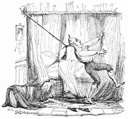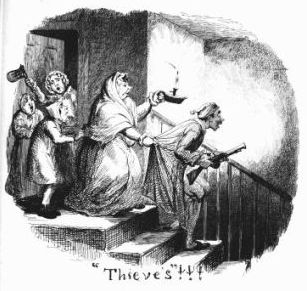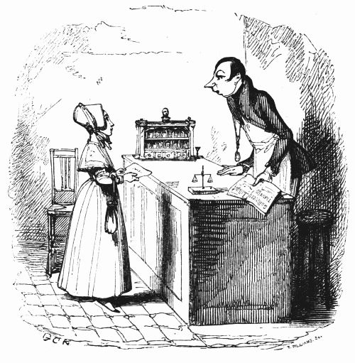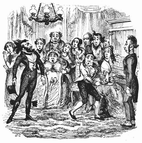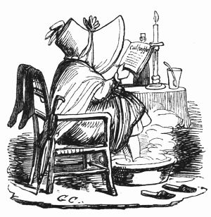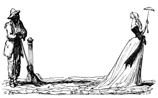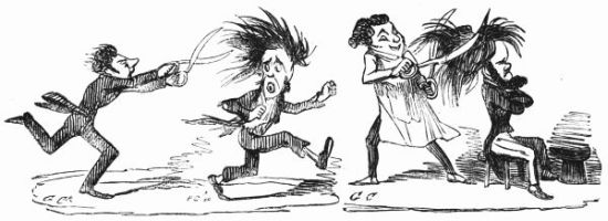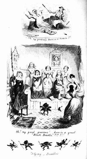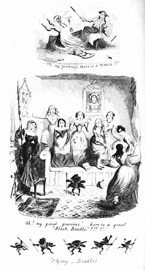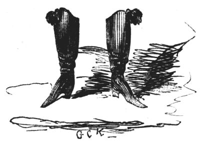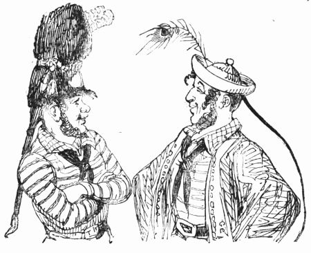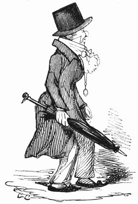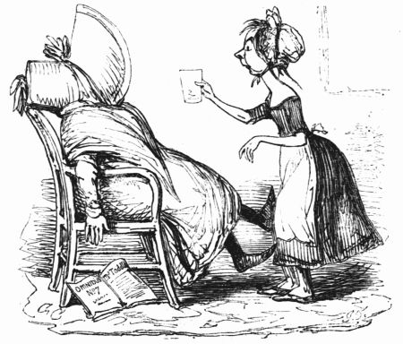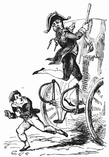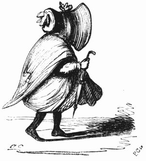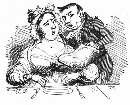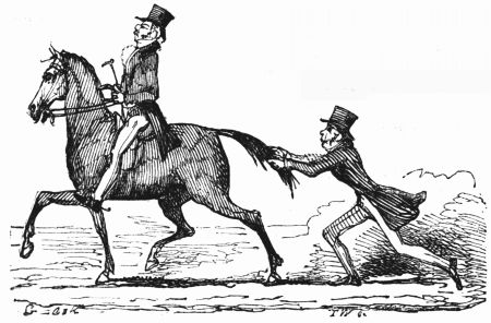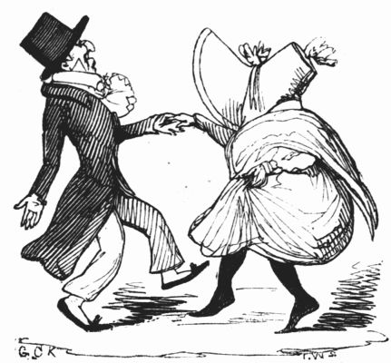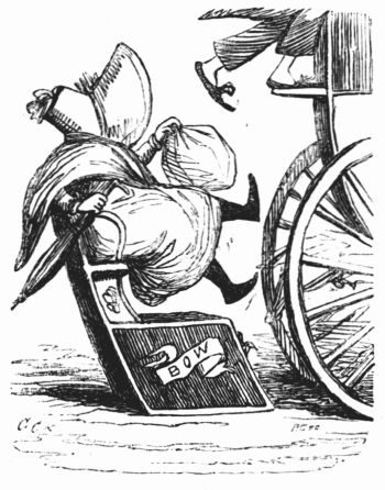Trusting that we shall yet live to be on amicable terms with Col. W., we shall now describe his gallant conduct in escorting Mrs. Toddles to Bow, to spend their Christmas eve in that favoured vicinity, her dear native place, which, it appears, she has been vainly endeavouring to reach; these last nine months. Resolved however to have nothing to do with an "omnibus," they found out one of the old-fashioned stages, but, being too late (as usual!) to secure inside places, were compelled to go outside. Mrs. T. and the colonel seated themselves very comfortably in the basket or dickey. Scarcely however had they advanced on their journey beyond Aldgate pump, when, lamentable to relate, the dickey, affected by old age or by a violent jolt, suddenly separated itself from the coach, and down it came crash with Mrs. T. into the road; the gallant colonel springing to the roof as nimbly as a lamplighter. The feelings of both, as Hamlet remarks, may be more easily conceived than described. Happily however no serious injury was sustained by Mrs. T. beyond a slight fracture of the bonnet, not likely to prove fatal to its shape; her dress cap too which she was carrying in paper was also a little crumpled, and there was a crash of something in her pocket which, she most positively alleged, was not a bottle. Colonel W., as soon as the coach could be stopped, descended and returned to the scene of the accident in time to snatch that lady from the risks to which her delicacy was exposed, which was shocked only to the extent of proclaiming a fact previously known perhaps to many, that she wore black stockings. We are truly[300] happy to state that after a little delay they reached their place of destination together in perfect safety; and the very best security which we can offer to the friends of Mrs. Toddles that she suffered nothing from the untoward occurrence, is, that she was enabled in the course of the delightful evening which she spent, to take part in a cotillon with her friend the gallant Colonel; and when they were last seen, they were dancing away gloriously together.