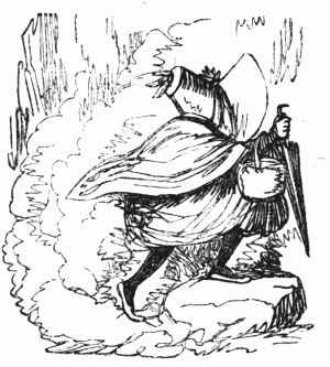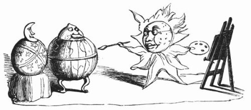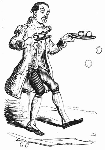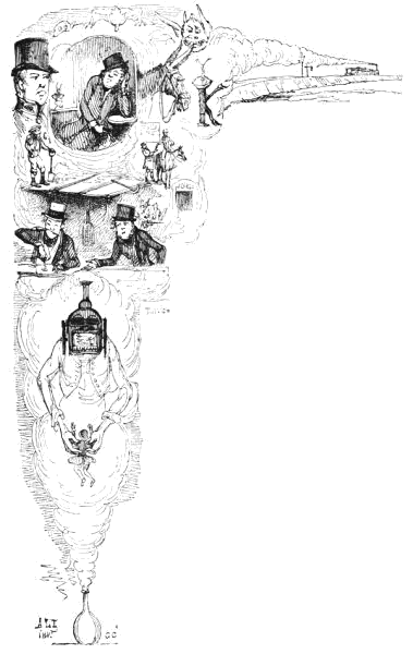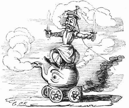 So now, my little masters and misses, have you each got your No. 1 ready? Always take care of that. Now then, please to look at the top of the circular picture which represents the world, and there you behold Her Majesty Queen Victoria on her throne, holding a court, with Prince Albert, in his field-marshal's uniform, by her side, and surrounded by ladies, nobles, and officers of state. A little to the right are the heads of the Universities, about to present an address. Above the throne you behold the noble dome of St. Paul's, on each side of which may be seen the tall masts of the British navy. Cast your eyes, my pretty dears, below the throne, and there you behold Mr. and Mrs. John Bull, and three little Bulls, with their little bull-dog; one little master is riding his papa's walking-stick, while his elder brother is flying his kite—a pastime to which a great many Bulls are much attached. Miss Bull is content to be a little lady with a leetle parasol, like her mamma. To the right of the kite you behold an armed man on horseback, one of those curious figures which, composed of goldbeater's skin, used to be sent up some years ago to astonish the natives; only they frightened 'em into fits, and are not now sent up, in consequence of being put down. And now you see "the world goes round." Turn your eyes a little to the right to the baloon and parachute, and then look down under the smoke of a steamer, and you behold a little sweep flourishing his brush on the chimney-top, and wishing perhaps that he was down below there with Jack-in-the-green. Now then, a little more to the right—where you see a merry dancing-group of our light-heeled and light-hearted neighbours, the leader of the party playing the fiddle and dancing on stilts, while one of his countrymen is flying his favourite national kite—viz., the soldier. In the same vicinity, are groups of German gentlemen, some waltzing, and some smoking meerschaums; near these are foot-soldiers and lancers supporting the kite-flyer. Now, near the horse, my little dears, you will see the mule, together with the Spanish muleteers, who, if not too tired, would like to take part in that fandango performed to the music of the light guitar. Look a little to the left, and you behold a quadrille-party, where a gentleman in black is pastorale-ing all the chalk off the floor; and now turn your eyes just above these, and you behold a joyful party of convivialists, with bottles in the ice-pail and bumpers raised, most likely to the health of our gracious Queen, or in honour of the Great Captain of the Age. And now, my little dears, turn your eyes in a straight line to the right, and you will perceive St. Peter's at Rome, beneath which are two young cardinals playing at[x] leap-frog, not at all frightened at the grand eruption of Mount Vesuvius which is going on in the distance. From this you must take a leap on to the camel's back, from which you will obtain a view of the party sitting just below, which consists of the grand Sultan smoking desperately against Ali Pacha. Now, look a little lower down, and you will see a famous crocodile-catcher of the Nile, said to bear a striking resemblance to Commodore Napier; and now, look upwards again to the farthest verge, and you behold the great Pyramid, and a wild horseman chasing an ostrich not so wild as himself. Now, the world goes round a little more, and you see some vast mountains, together with the temples of Hindostan; and upon the palm-tree you will find the monkeys pulling one another's tails, being very uneducated and having nothing else to do: here, also, you will discern the Indian jugglers, one throwing the balls, and another swallowing the sword, a very common thing in these parts. And now, my little dears, you can plainly see several very independent gentlemen and loyal subjects standing on their heads in presence of the Emperor of ever so many worlds, and the brother of the sun and moon; and behind these, hiding the wall of China, you will see a quantity of steam, (for they are in hot water there,) that issues from the tea-kettles. Leaving his Celestial Majesty smoking his opium, and passing the junks, temples, and pagodas, you see a Chinese joss upon his pedestal; and now you can descend and join that pretty little tea-party, where you will recognise some of your old acquaintances on tea-cups; only, if you are afraid of the lion which you see a long way off, you can turn to the left, and follow the tiger that is following the elephant like mad: and now, my little dears, you can jump for safety into that palanquin carried by the sable gentry, or perhaps you would join the party of Persians seated a little lower, only they have but one dish and no plates to eat out of. Just above this dinner-party you behold some live venison, or a little antelope eating his grass for dinner while a boa-constrictor is creeping up with the intention of dining upon him; so you had better make your way to that giraffe, who is feeding upon the tops of trees, which habit is supposed to have occasioned the peculiar shape of that remarkable quadruped; and now you fall again in the way of that ramping lion, from whose jaws a black is retreating only to encounter a black brother more savage than the wild beast. And now, if your eye follows that gang of slaves, chained neck to neck, who are being driven off to another part of the world, you will see what treatment they are doomed to experience there, in the flogging which is being administered to one of their colour—that is to say, black as the vapour issuing from that mountain in the distance; it is Chimborao, or Cotapaxi, I can't say exactly which, but it shall be whichever you please, my pretty little dears. In the smoke of it an eagle is carrying off a lamb—do you see?—Stop, let me wipe the glasses!—Ah, yes, and now you can clearly behold a gentleman of the United States smoking his cigar in his rocking-chair. A little behind is another gentleman driving hi