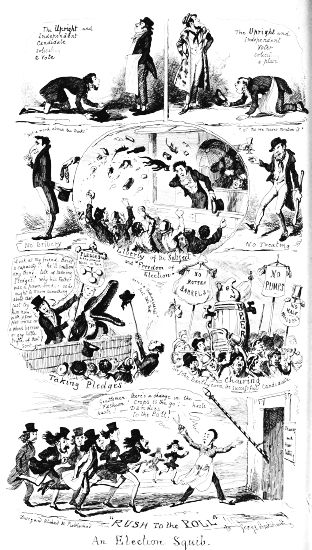 [4] Our respectable correspondent must have visited the English Opera in his younger days, or else Charles Mathews must have paid a visit to Crooksley. He must also have seen the printed addresses circulated lately in Deptford during a contest for the office of gravedigger, where the proceedings were as outrageous as these that he describes.