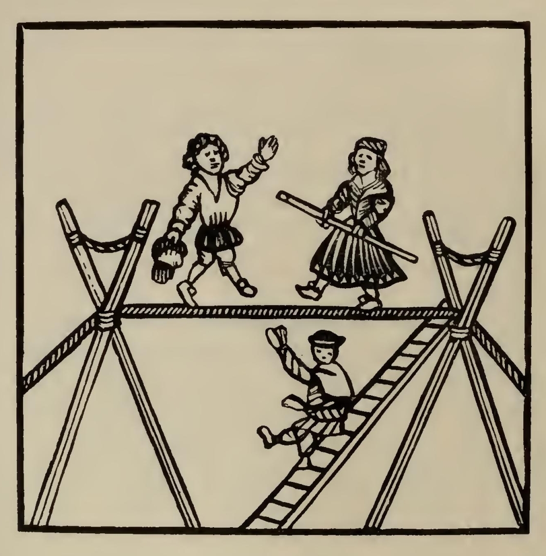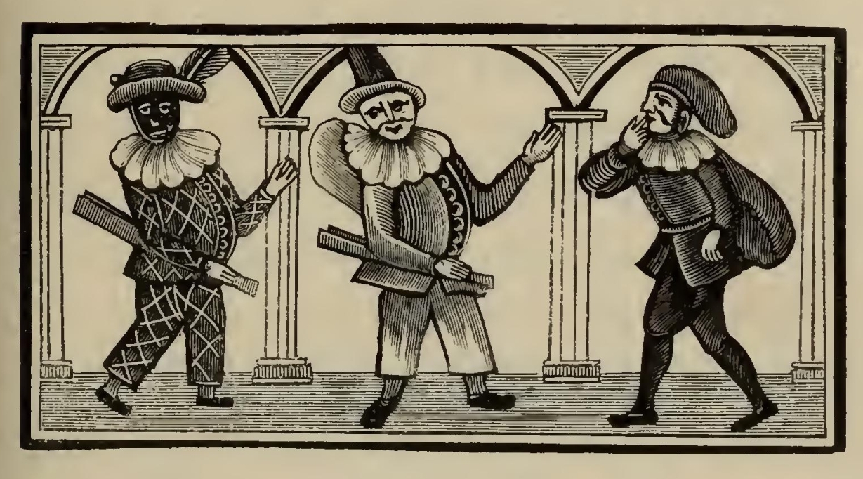 “Tarlton being at the court all night, in the morning he met a great courtier coming from his chamber, who, espying Tarlton, said, 'Good-morrow, Mr. Didimus and Tridimus.' Tarlton being somewhat abashed, not knowing the meaning thereof, said, 'Sir, I understand you not; expound, I pray you,' Quoth the courtier, 'Didimus and Tridimus are fool and knave.' 'You overload me,' replied Tarlton, 'for my back cannot bear both; therefore take you the one, and I will take the other; take you the knave, and I will carry the fool with me.' And again; there was a nobleman that asked Tarlton what he thought of soldiers in time of peace?