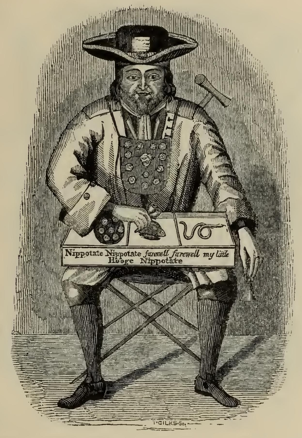 Many other jokes are told of Tarlton; how, when he kept the sign of the Tabor, a tavern in Gracechurch street, being chosen scavenger, he neglected his duty, got complained of by the ward, shifted the blame to the raker, who transferred it to his horse, upon which he (Tarlton) sent the horse to the Compter, and the raker had to pay a fee for the redemption of his steed! And how he got his tavern bill paid, and a journey to London scot-free, by gathering his conceits together, and sending his boy to accuse him to the magistrates for a seminary priest! the innkeeper losing his time and charges, besides getting well flouted into the bargain.