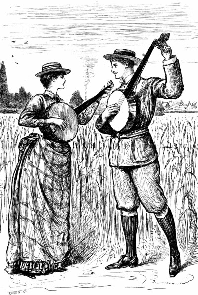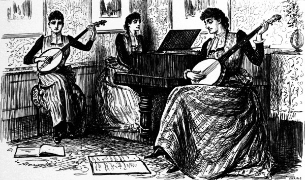 The Miss Browns (of "a good" Bayswater family) playing "Buffalo Gals," with variations, on two American banjoes and an American parlor-grand.