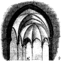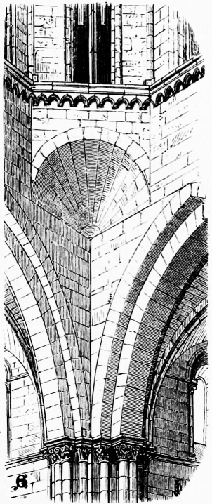 [416] The round portion of the Temple Church, London, has its aisle groined with alternate bays of square and triangular outline. The latter have no ribs, and are constructed differently from those at Toledo.