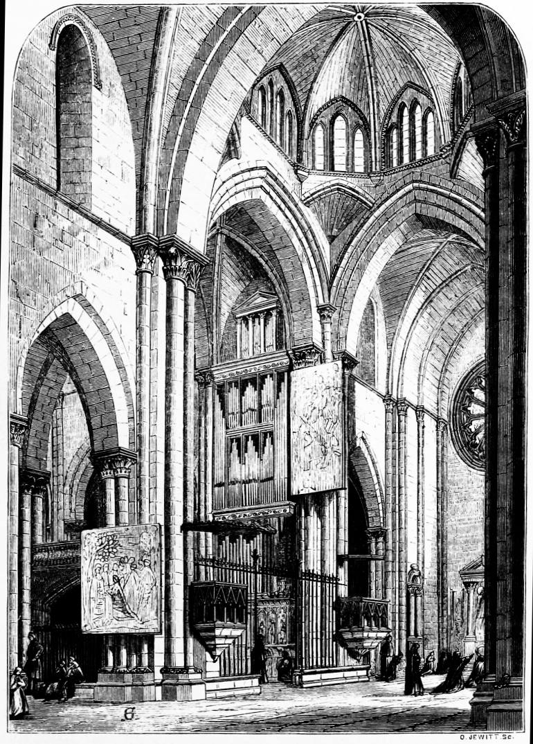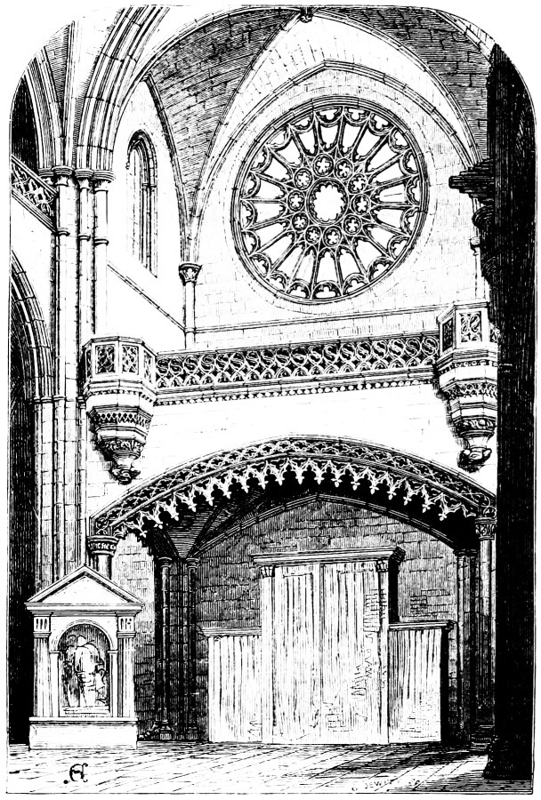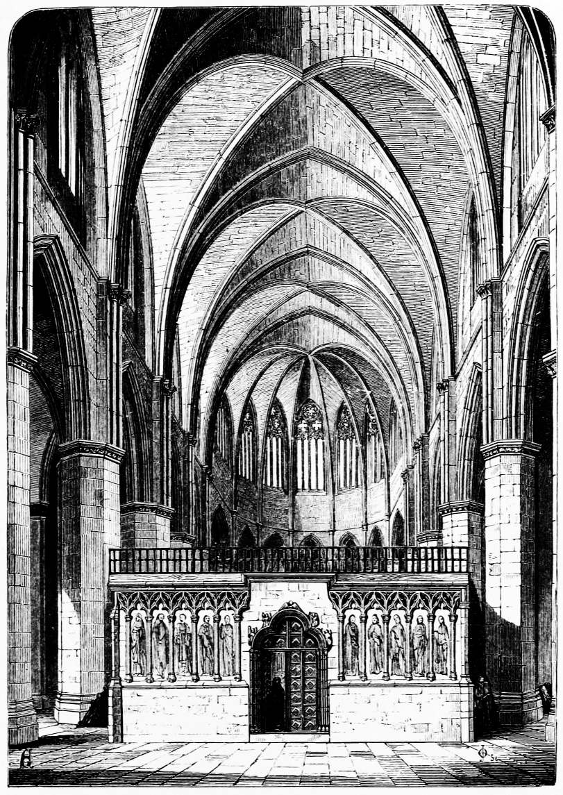 [411] The parallel holds good in very small matters. At Westminster the clergy and choir assemble in the choir, and begin the service so soon as the clock strikes. In several Spanish churches the same custom obtains. I think it would be a great gain if the metal screens across the transepts were moved so as to form the narrow central passage from the choir to the altar, so common in Spain. They would then have some meaning and use, which they certainly have not now.